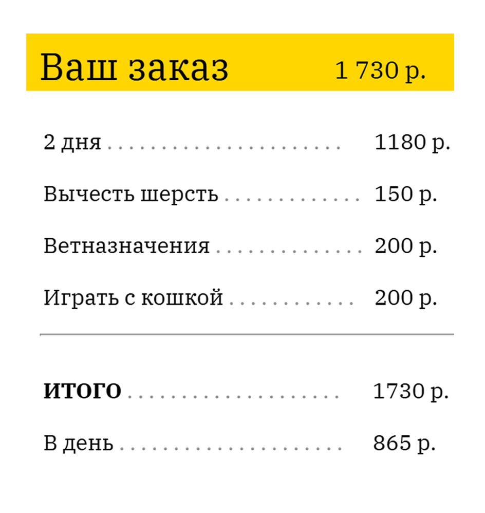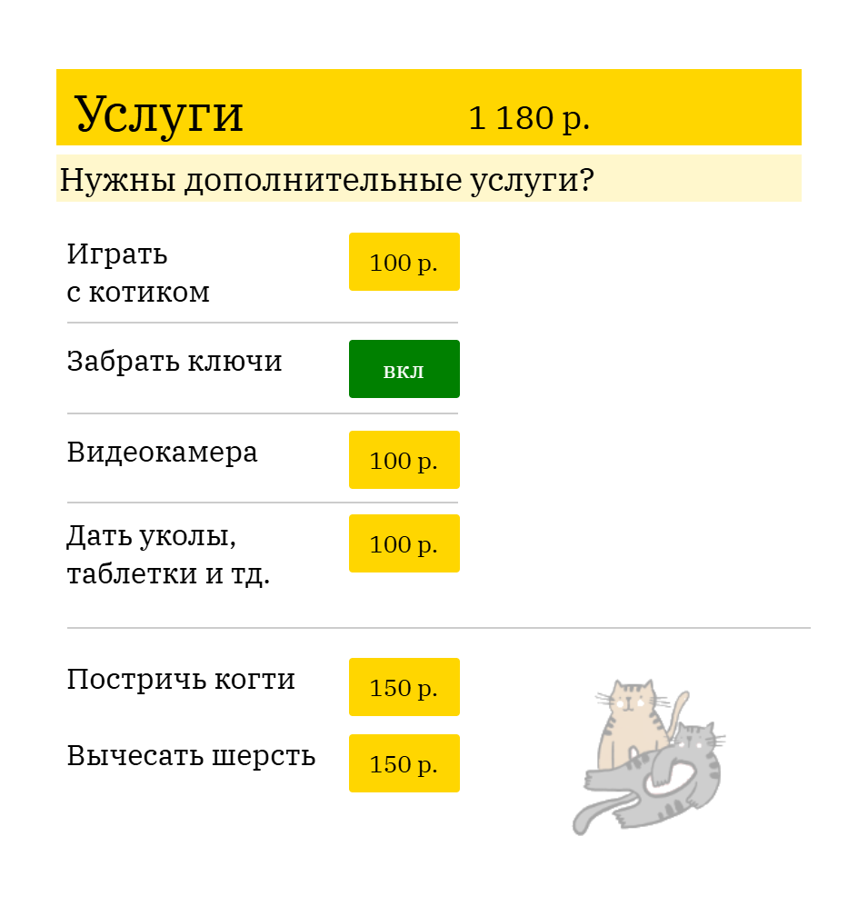 При желании можно заказать предварительное знакомство с ситтером — это стоит 250—300 ₽. За каждое дополнительное животное и их перевозку тоже придется доплатить.