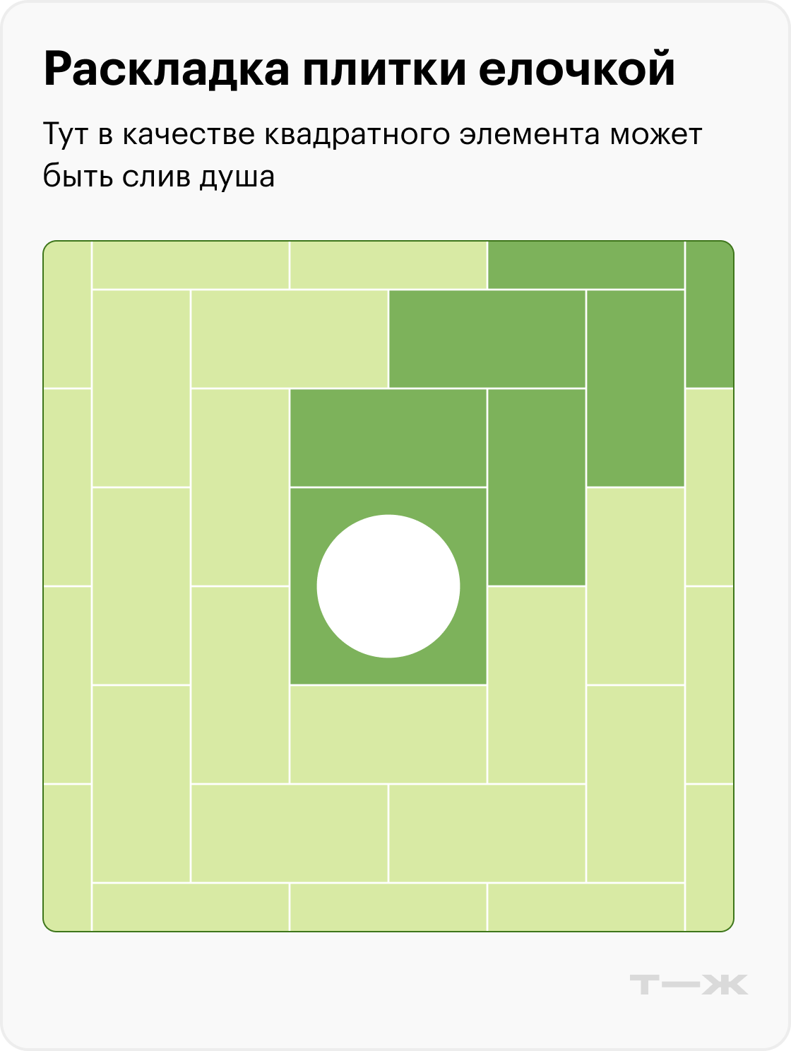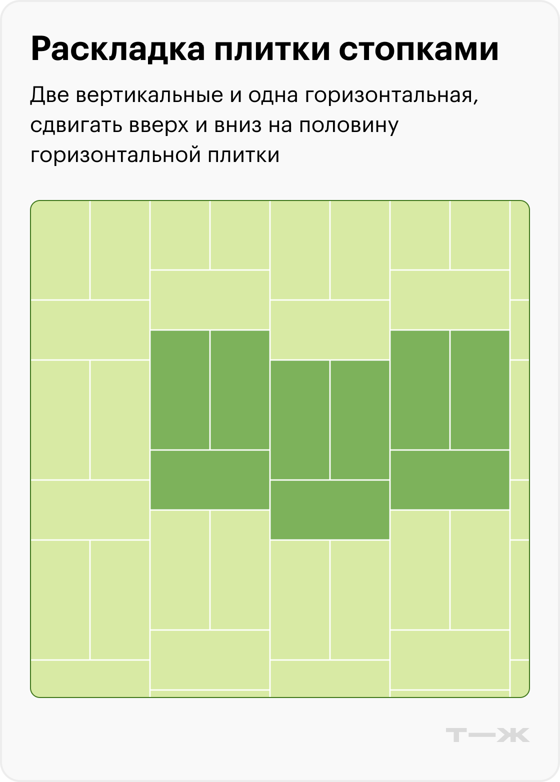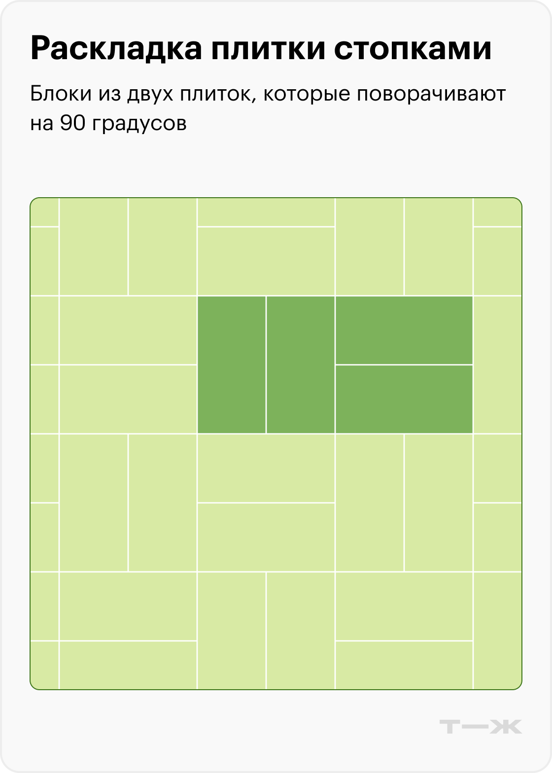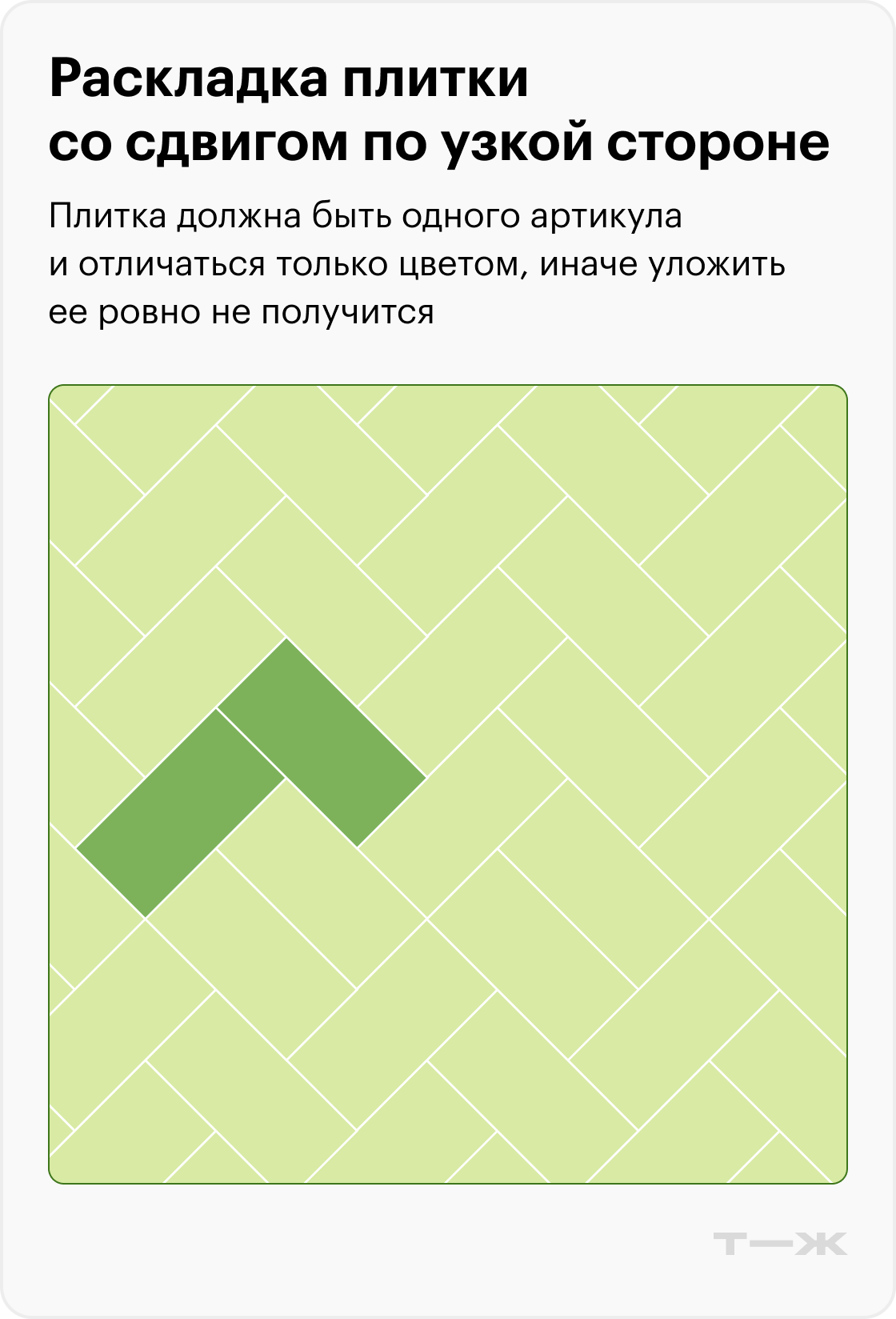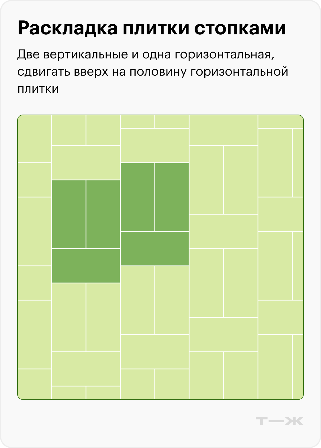 Такую раскладку можно комбинировать с квадратной плиткой или сделать только из прямоугольной.