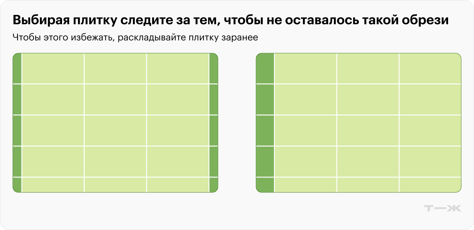 Выбирая любую плитку, неважно, однотонную, с узором, квадратную или прямоугольную, следите за тем, чтобы не оставалось такой обрези.