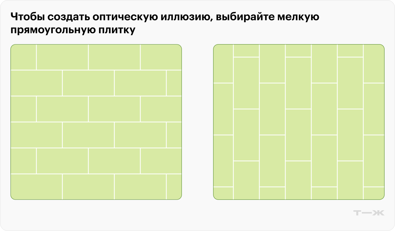 К сожалению, только с помощью раскладки нельзя сделать ванную выше и шире. Да, существует правило вертикальных и горизонтальных линий. Оно предполагает, что чем больше вертикальных линий считывает наш глаз, тем сильнее он расширяет пространство в высоту. Чем больше горизонтальных линий — тем шире кажется пространство. В комнате 2 × 2 м это не сработает: мы все-таки здраво оцениваем размеры помещения, несмотря на линии.