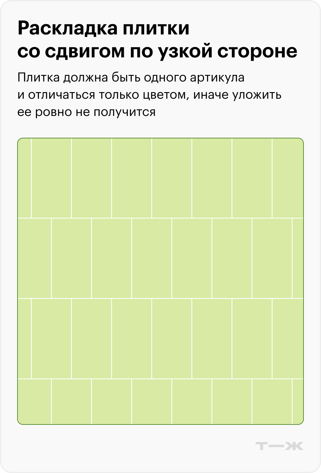 Есть еще вариант — сдвинуть плитку на половину по узкой стороне — получится нестандартный рисунок. Применимо горизонтально и вертикально.