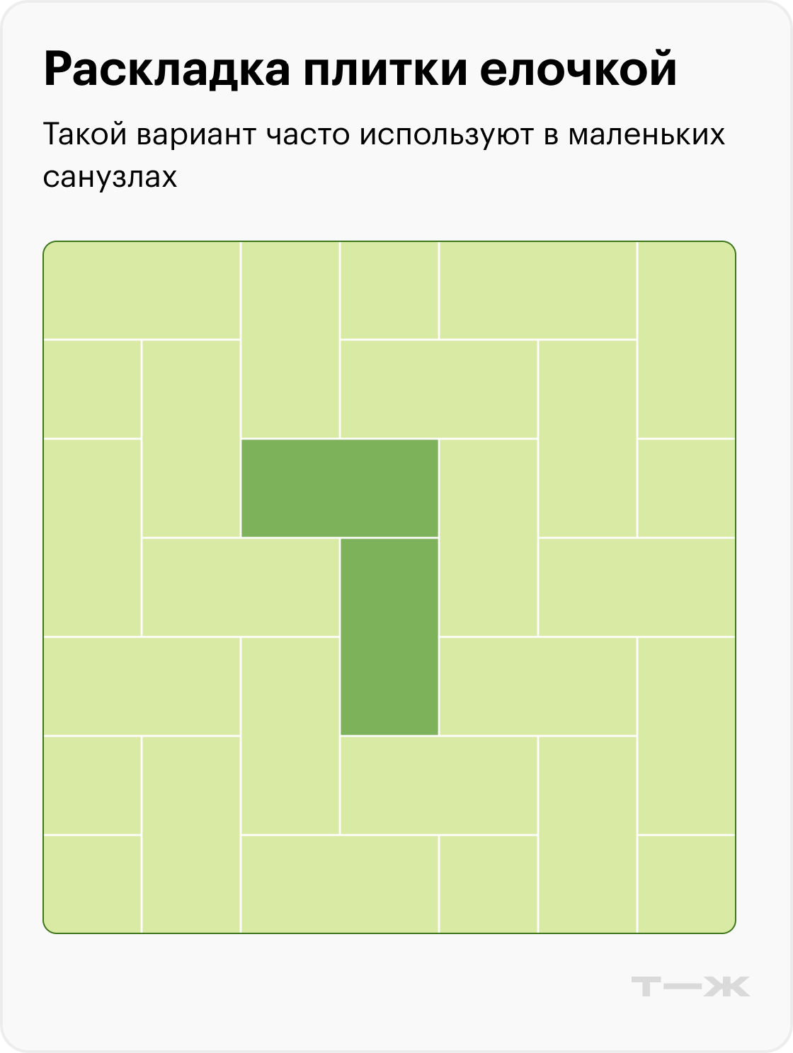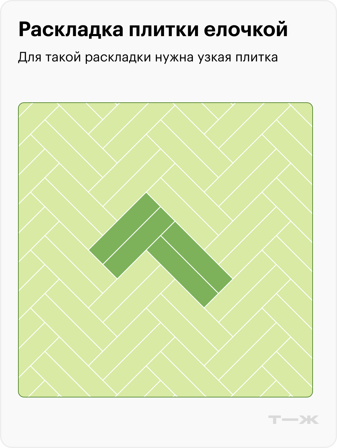 Популярная раскладка мелкой прямоугольной плитки — елочка. Можно поворачивать ее по диагонали или сделать прямой. Из более узкой плитки получится и двойная елочка.