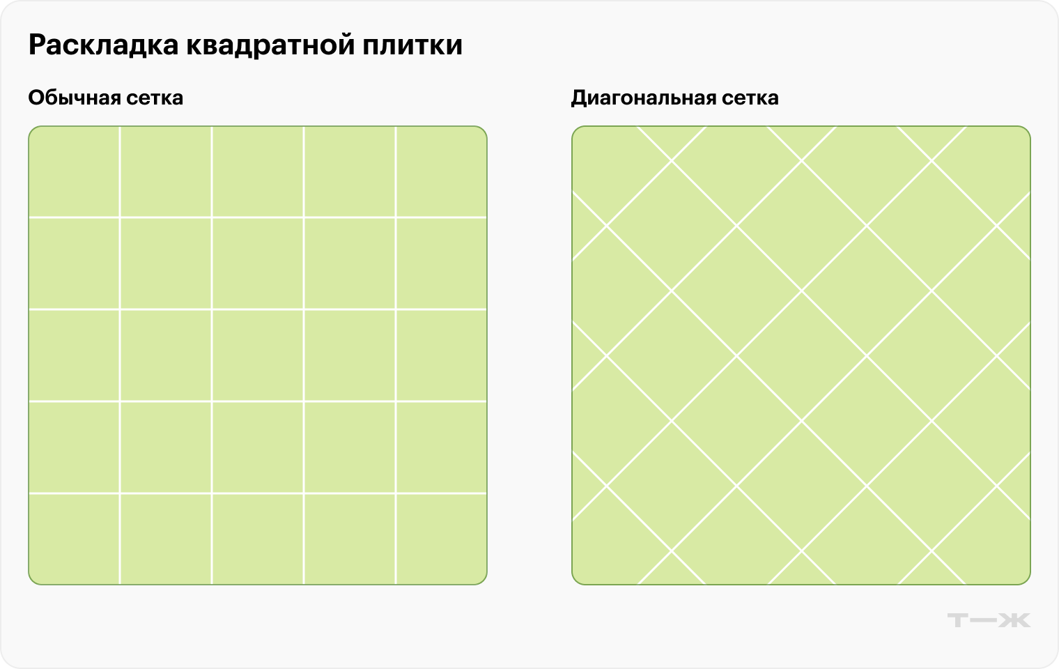 С квадратной плиткой особенно не разбежишься: из-за ровных сторон гораздо сложнее придумать что-то креативное. Ее можно сдвигать вверх-вниз и вправо-влево или класть по диагонали.