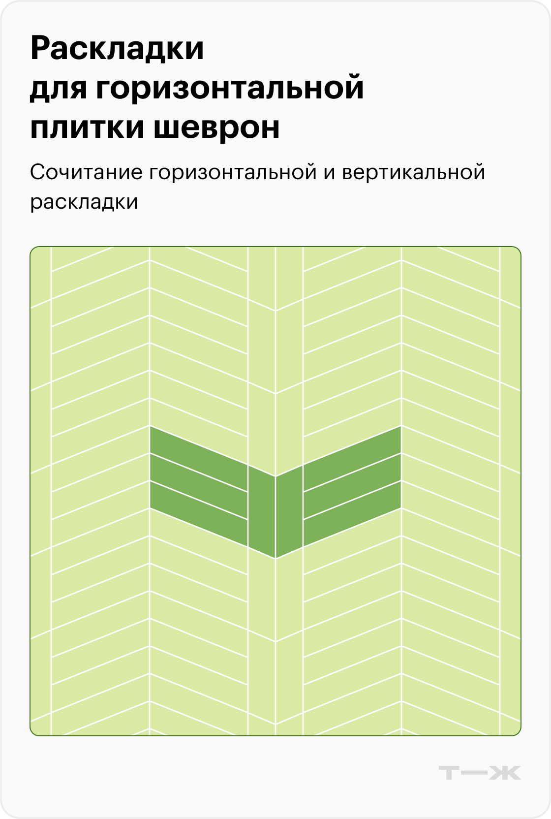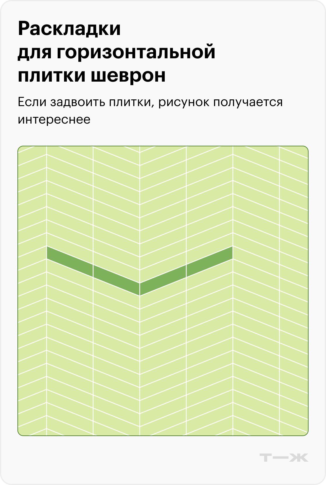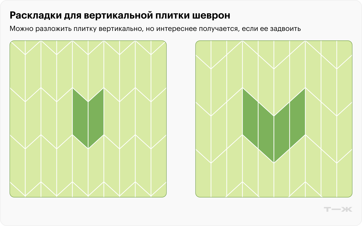 Шеврон — популярный вид плитки в форме параллелограмма. За счет формы такая плитка позволяет менять варианты раскладки. Обратите внимание, что существует правый и левый шеврон, это надо учитывать при закупке.
