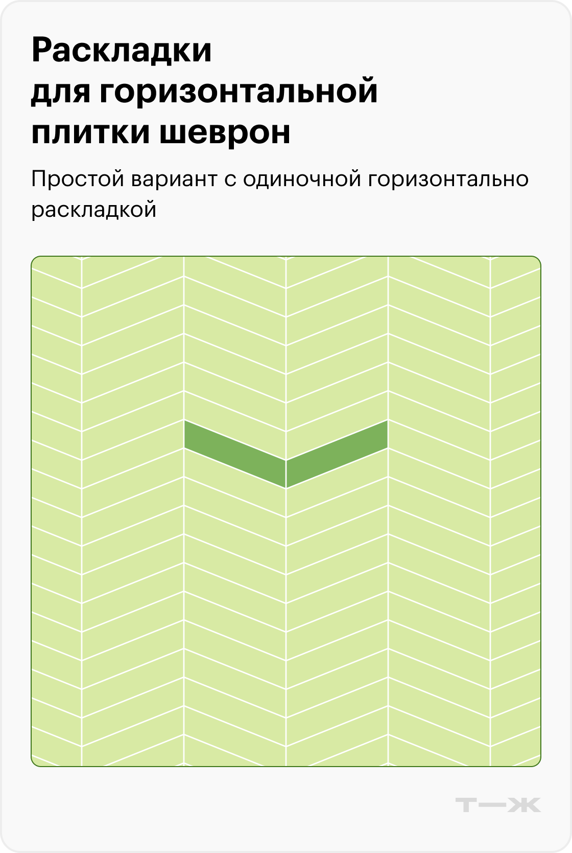Для такой раскладки подойдет узкая прямоугольная плитка, например «кабанчик». Чем меньше ширина плитки относительно длины, тем интереснее получится узор.