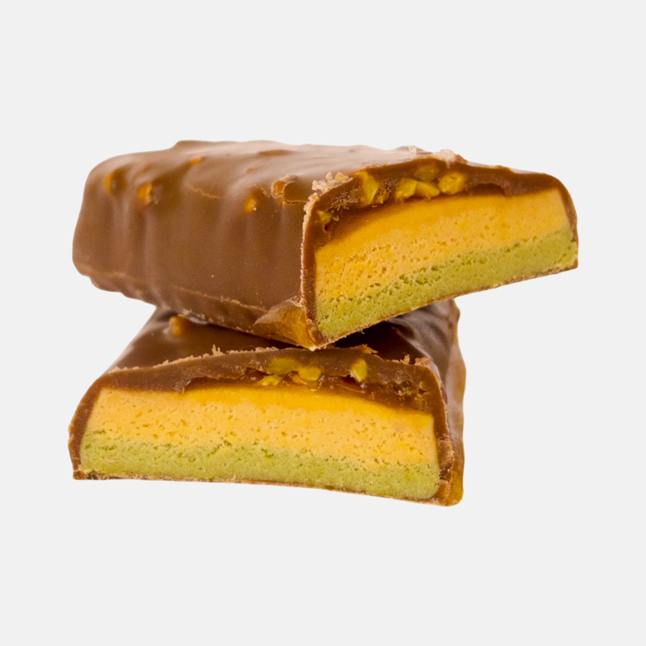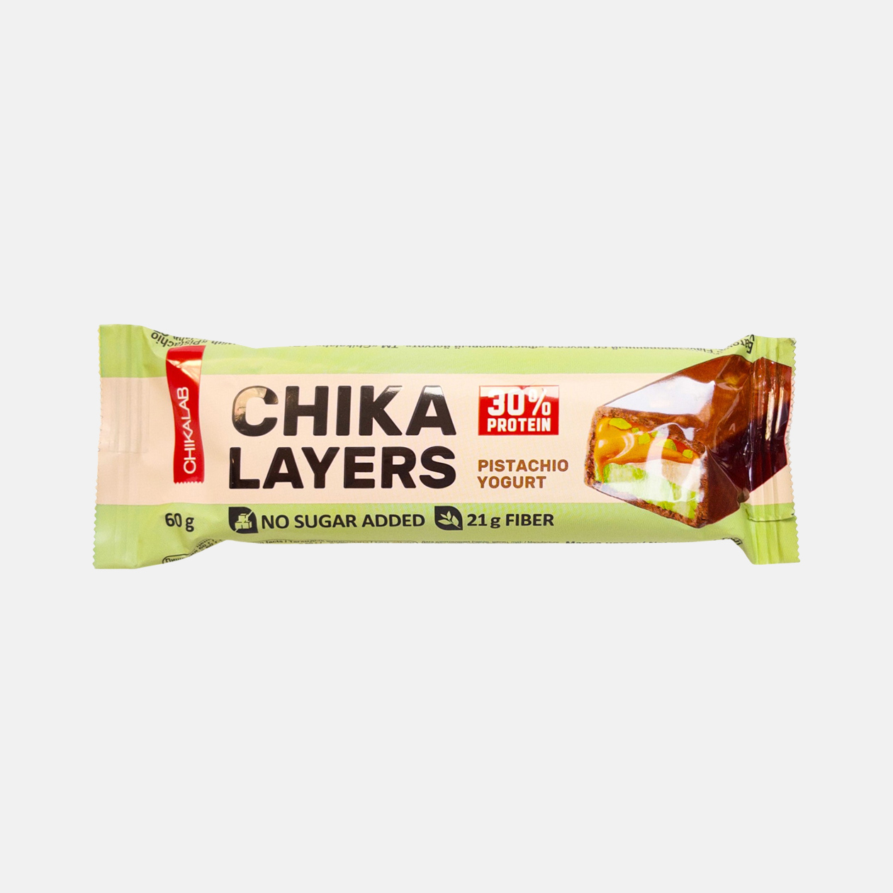 Начинка и текстура. Я взяла вкус «фисташковый йогурт». В батончике четыре слоя: ванильный протеин, фисташковый протеин, карамель и шоколад с кусочками фисташки. За счет последнего слоя снек больше напоминает шоколадный батончик.