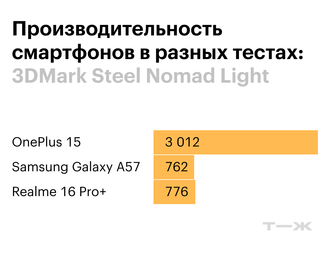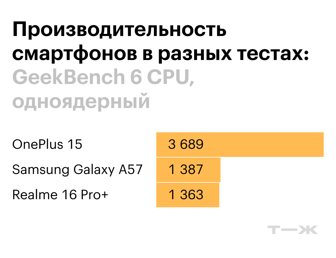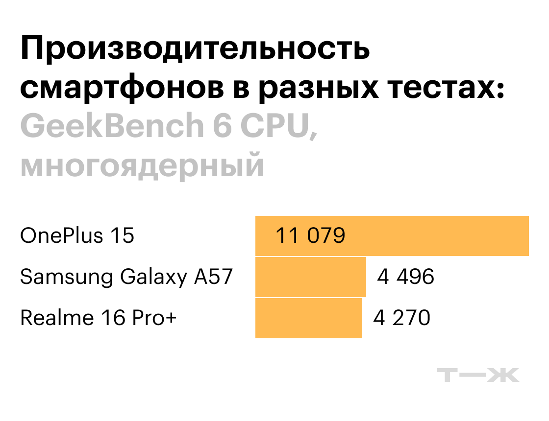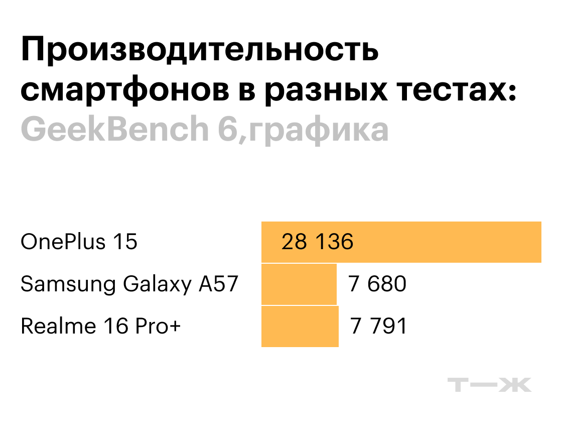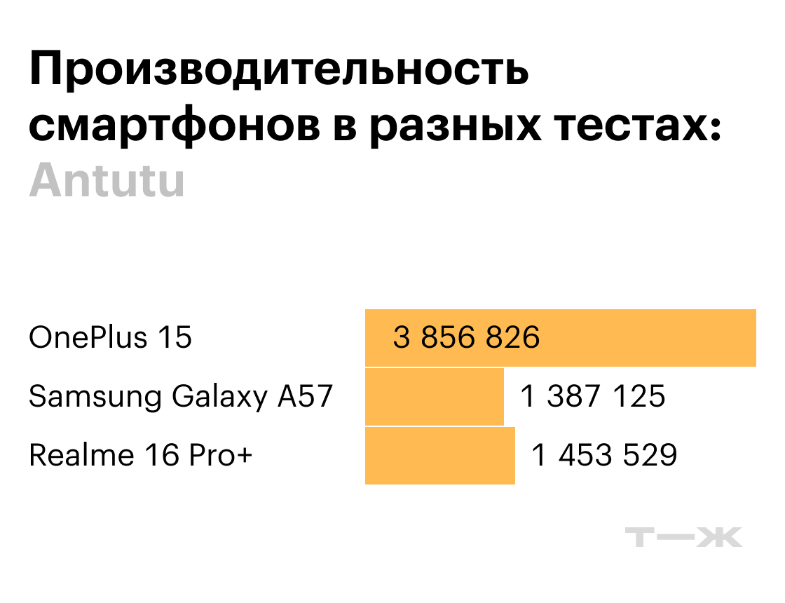 Производительность Realme 16 Pro+ и Samsung Galaxy A57 примерно одинаковая. Чипы Qualcomm Snapdragon 7 Gen4 и Exynos 1680 относятся к одному классу и действительно работают похоже. Оба смартфона достаточно мощные для того, чтобы запускать любые современные приложения и игры без тормозов и подвисаний.