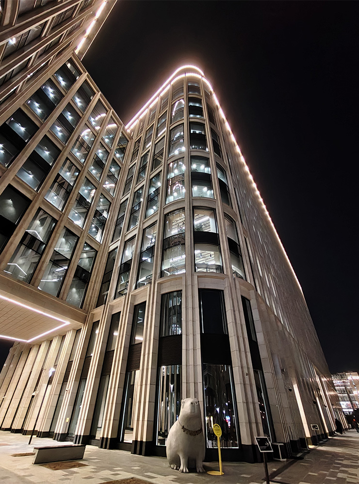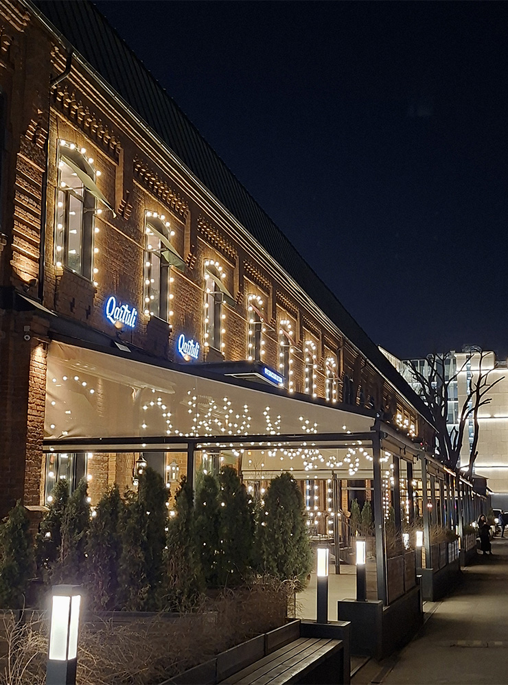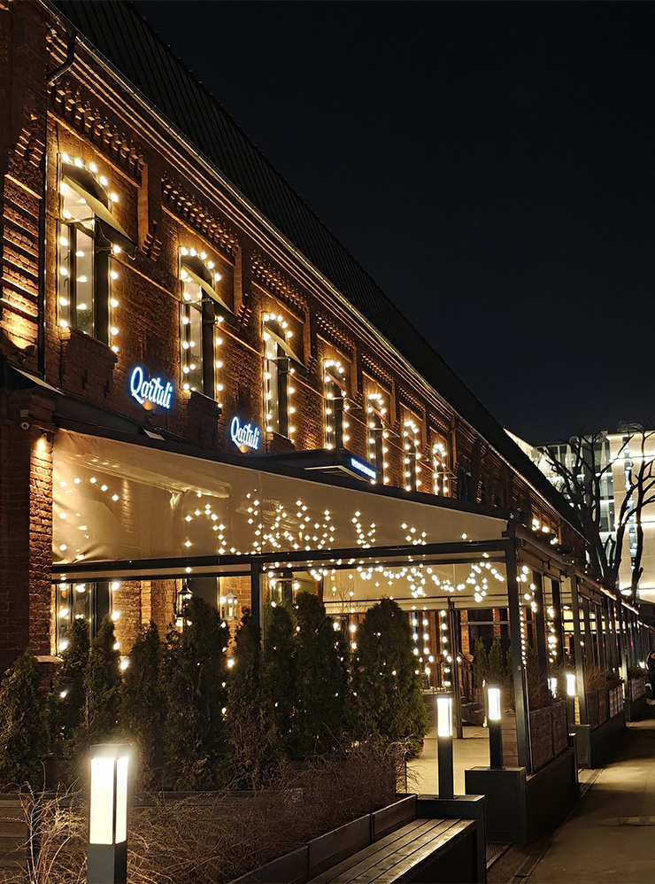Ночная съемка — за Realme. На фото с рестораном видно, что алгоритмы превратили деревья в зеленое месиво, зачем-то высветлили небо и потеряли значительную часть атмосферы, добавив поверх здания белесую дымку. Кадр на Realme значительно более контрастный и одновременно четкий, а оттенки ближе к реальным.