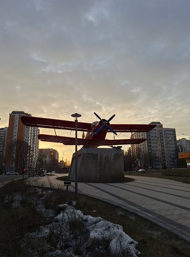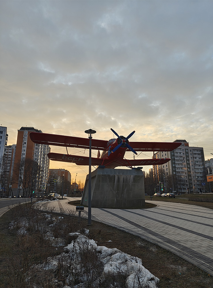 При сложном освещении Samsung Galaxy A57 сразу теряет четкость. На фото с самолетом хорошо видно, что трещины и потеки на постаменте, ветки на переднем плане, плитка и сам самолет расплывчатые, зашумленные и лишены мелких деталей. На Realme результат тоже не сравним с фотофлагманами, но все же картинка заметно качественнее.