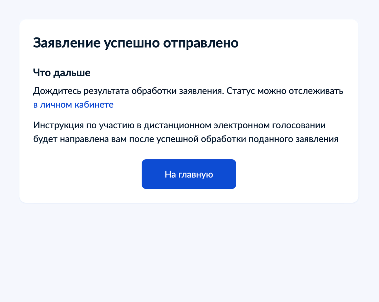 Электронное голосование для всех будет проходить на портале ДЭГ. Заполнить заявление можно на госуслугах. После ввода кода в форме для заполнения заявления оно уйдет в ЦИК, ему присвоят номер и статус «Учтено». Избирателю останется дождаться начала голосования и получить электронный бюллетень.