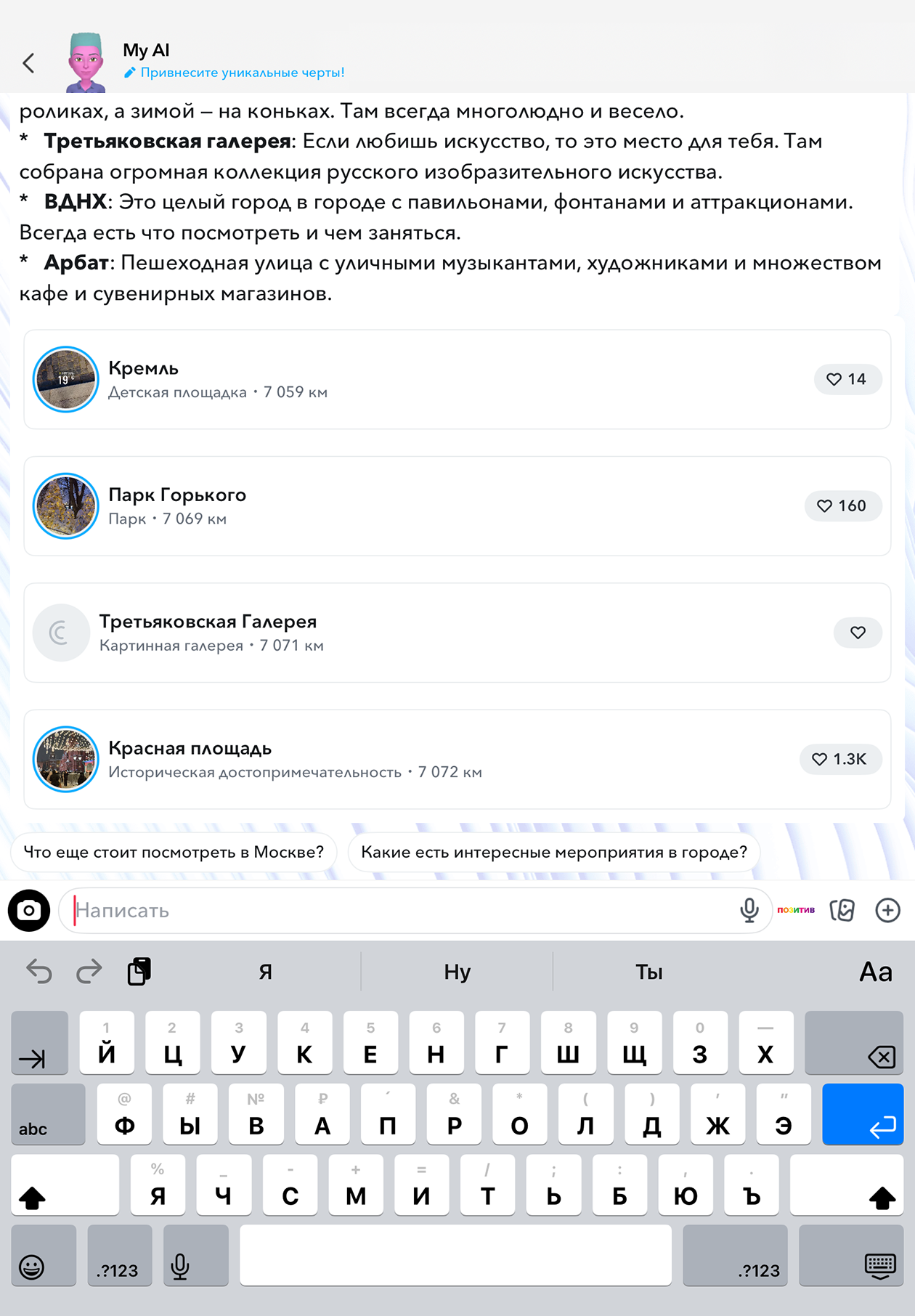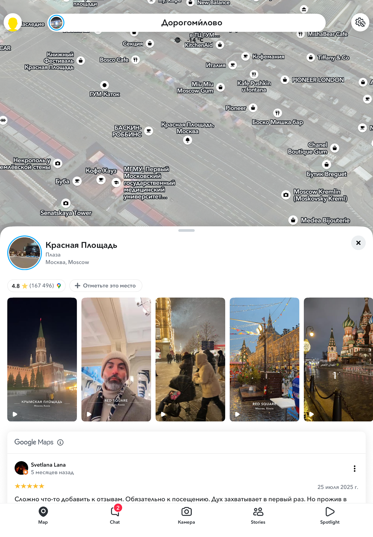 Snap Map — интерактивная карта, на которой можно увидеть снимки пользователей со всего мира. Так можно следить за интересными событиями чужими глазами. Тепловая карта подсказывает, где, скорее всего, происходит что-то интересное: если область красная или оранжевая — оттуда опубликовали много снимков, а синяя область, наоборот, указывает на низкую активность. С помощью чата с помощником My AI можно находить интересные места.