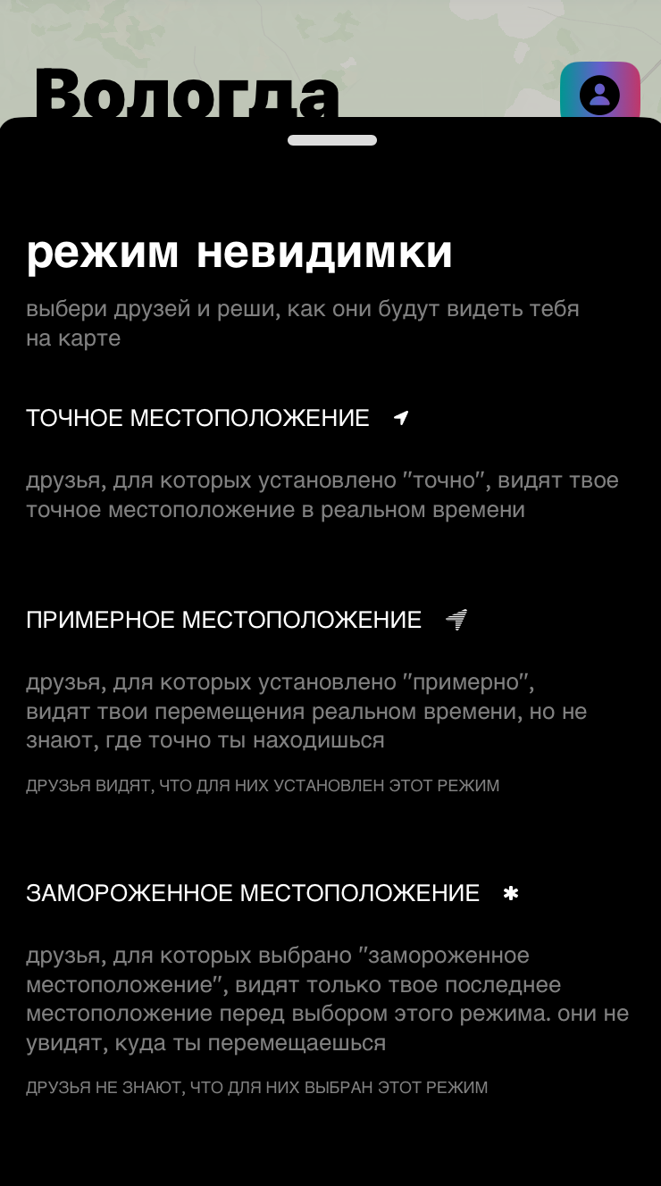 После одобрения заявки в друзья можно было увидеть, чем занят пользователь и где он находится. При этом локацию при желании можно было скрывать в режиме невидимки, но только временно.
