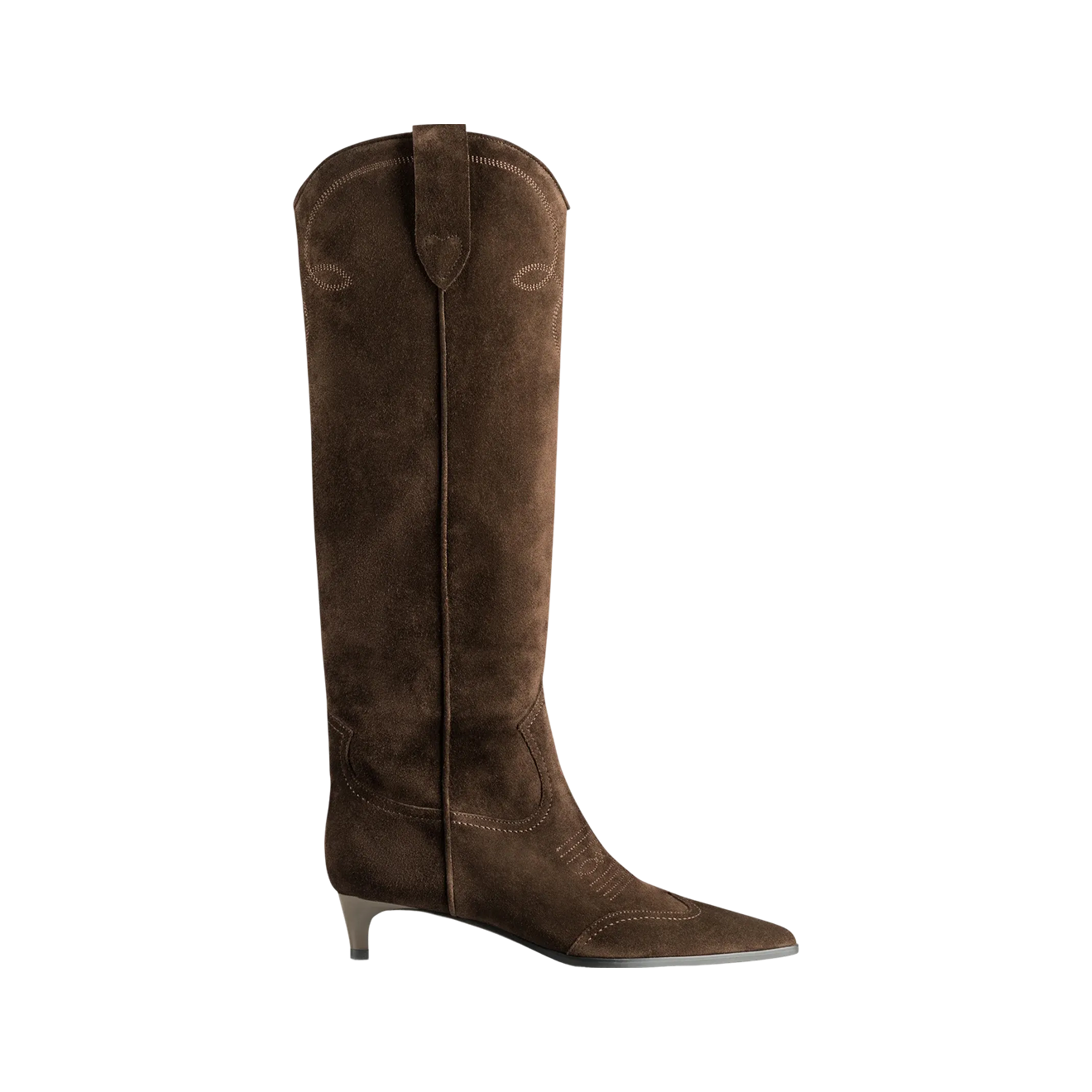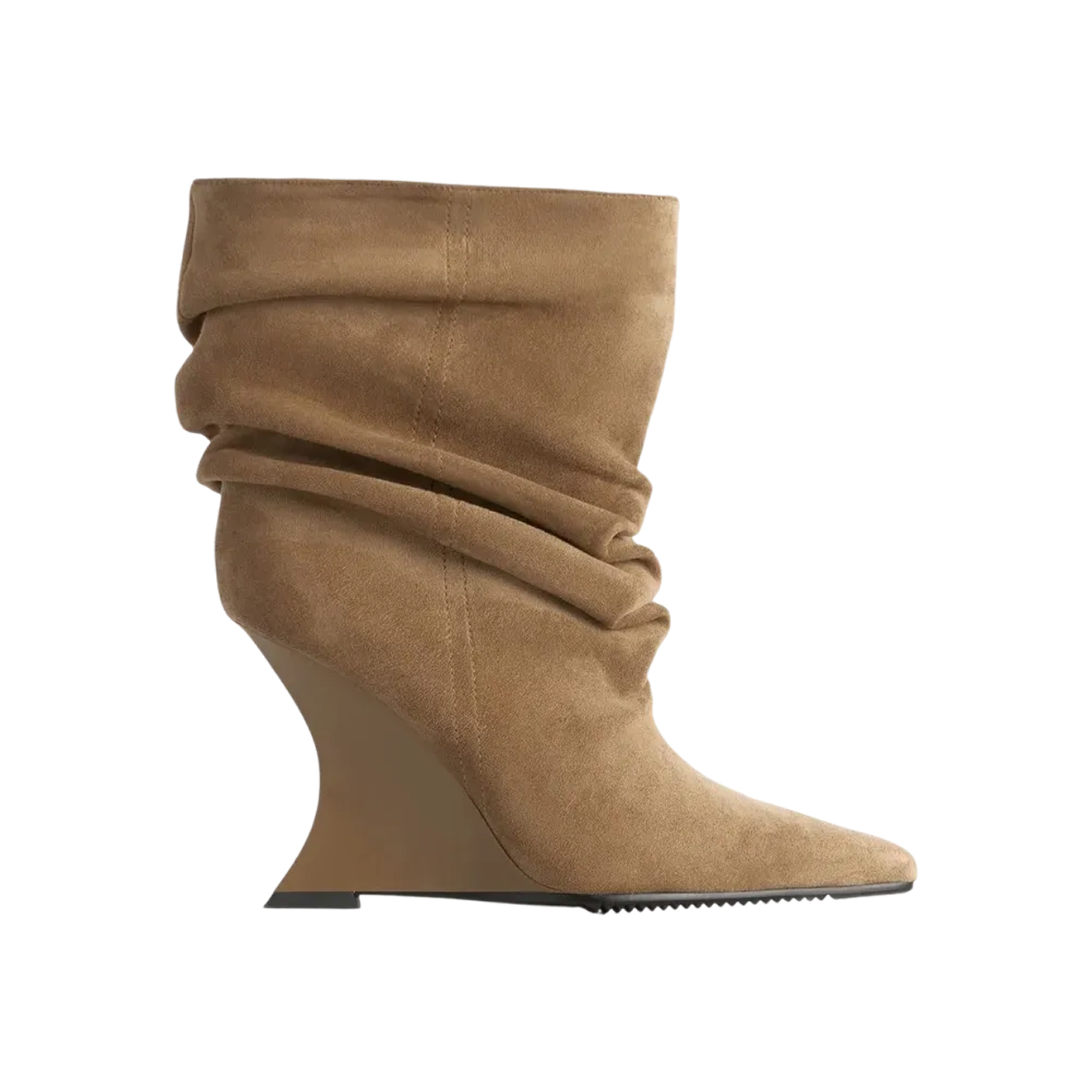 Ключевая модель Povod — казаки, но марка экспериментирует с силуэтами: в каталоге есть кроссовки-мюли, кудрявые балетки из овчины и байкерские сапоги.