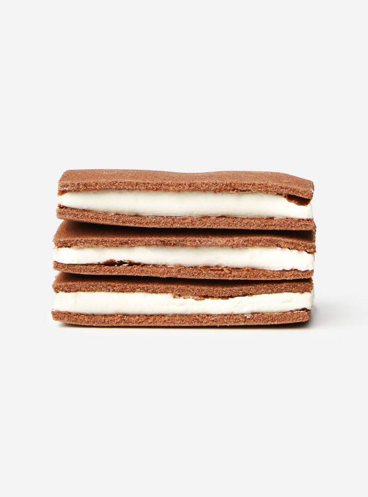 У пирожного яркий запах горького шоколада — это интересно. Пластинки печенья тонкие, а крема очень много. Поэтому снек скорее сливочный, чем бисквитный.