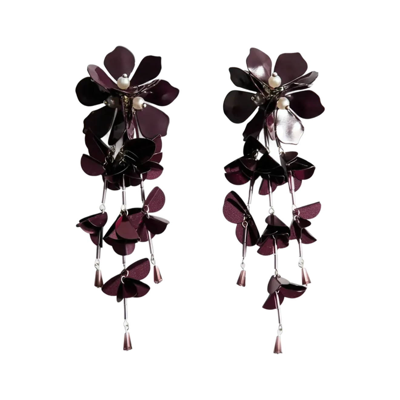 Массивные цветы в серьгах призывают весну и создают яркий акцент, но при этом не выглядят инфантильно. Оттенок бургунди «уравновешивает» и успокаивает объемный аксессуар