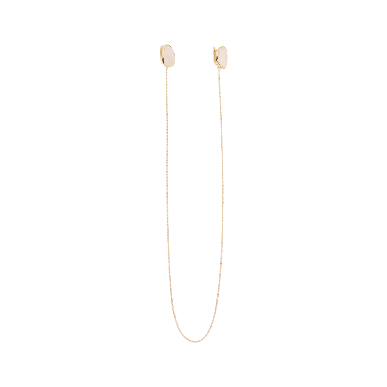 Связаны? Связаны. Эту пару сережек сложно назвать парой — пусеты из натурального перламутра соединены тонкой золотистой цепочкой. Аксессуар одновременно минималистичный и запоминающийся