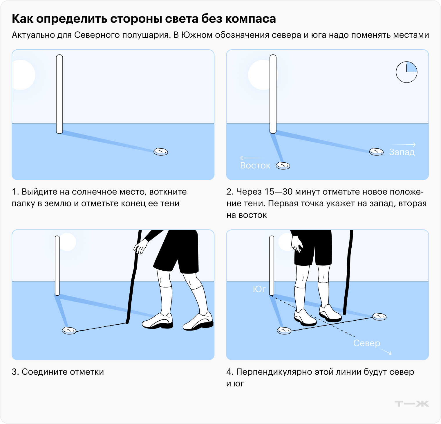 В Северном полушарии Солнце движется через юг с востока на запад, поэтому первая точка укажет на запад, вторая — на восток. Если провести между точками линию, перпендикулярно от них окажутся юг и север.