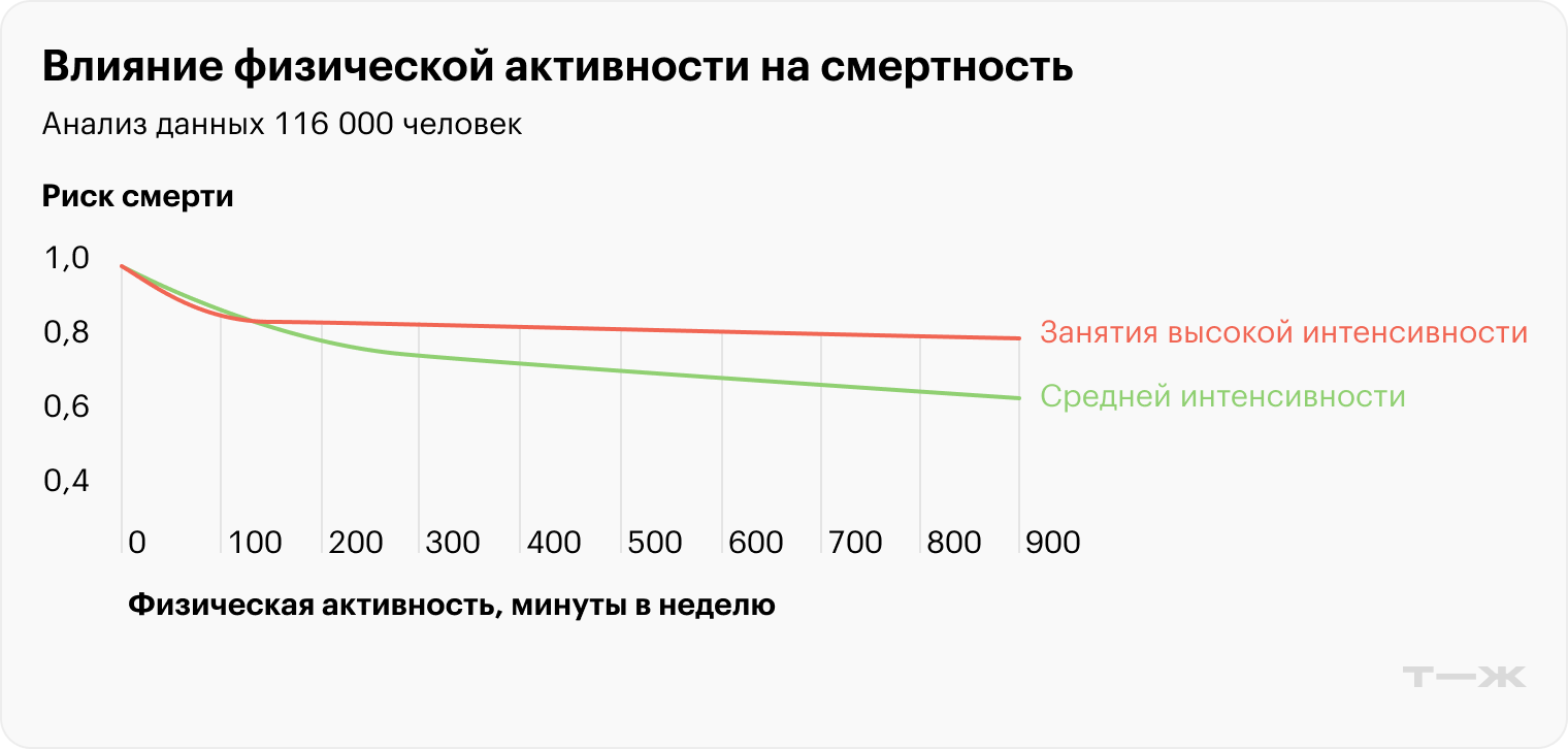 В 2022 году ученые провели анализ данных 116 000 человек за 30 лет. Они выяснили, что в группе людей с умеренной активностью от 20 до 74 минут в неделю смертность была на 9% меньше в сравнении с неактивными наблюдаемыми. Те, кто выполнял норму в 150—300 минут, снижали риск преждевременной смерти на 20%. Люди, занимавшиеся 600 минут в неделю, уменьшили его на 30%. С дальнейшим увеличением времени преимущества были незначительными.