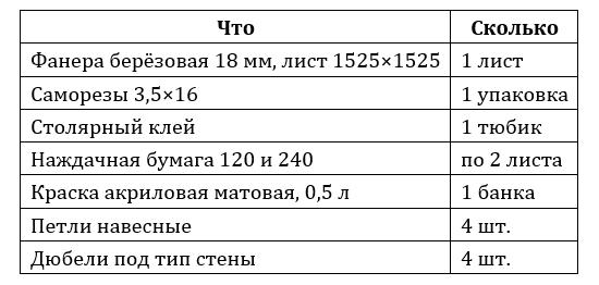 Важно о стоимости материалов. Конкретные цены я намеренно не указываю — они сильно зависят от факторов, которые у каждого свои. Качество фанеры — берёзовая доска может прийти дугой или винтом, и тогда это не материал, а дрова. Краска — дешёвая акриловая через полгода мелит и теряет цвет, нормальная стоит в разы дороже. Ещё влияет расстояние доставки, страна-производитель, способ и качество крепежа. Одни и те же саморезы от разных производителей ведут себя по-разному — у дешёвых срезает шлиц на третьем обороте. Поэтому ориентируйтесь на средний сегмент и не экономьте на том, что будет держать конструкцию на стене.