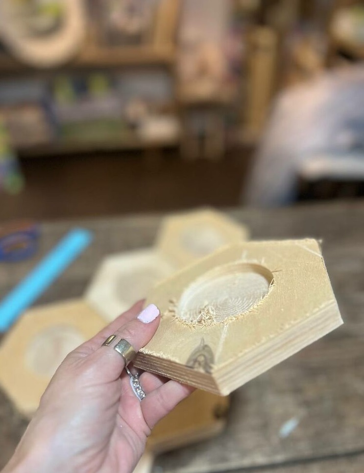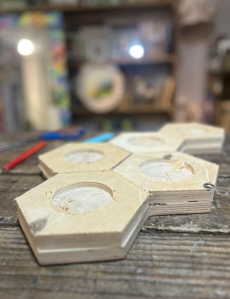 Шестиугольники режу на ЧПУ-станке — ровные грани, одинаковые размеры, повторяемость. Первый прототип я пилил лобзиком — честно, результат был такой, что Антонина посмотрела и сказала: «Дима, давай на станке». Она была права.
