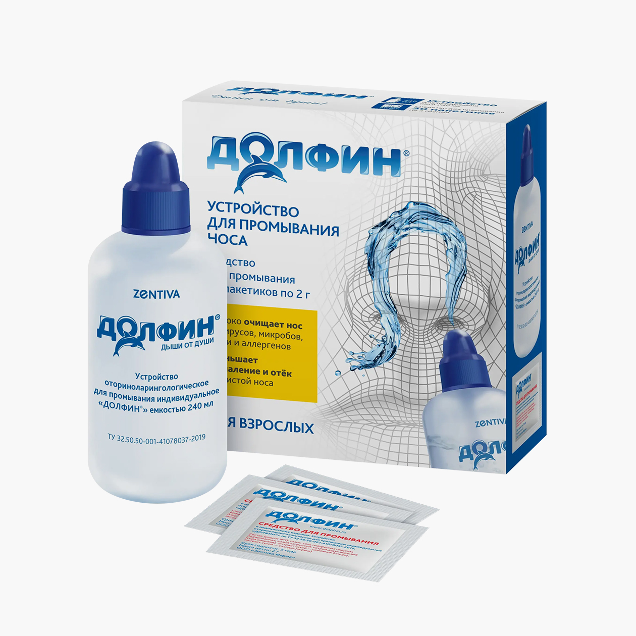 Устройство «Долфин». Им пользуется муж во время простуд. Цена — 627 ₽ за устройство и 30 пакетиков средства для промывания.