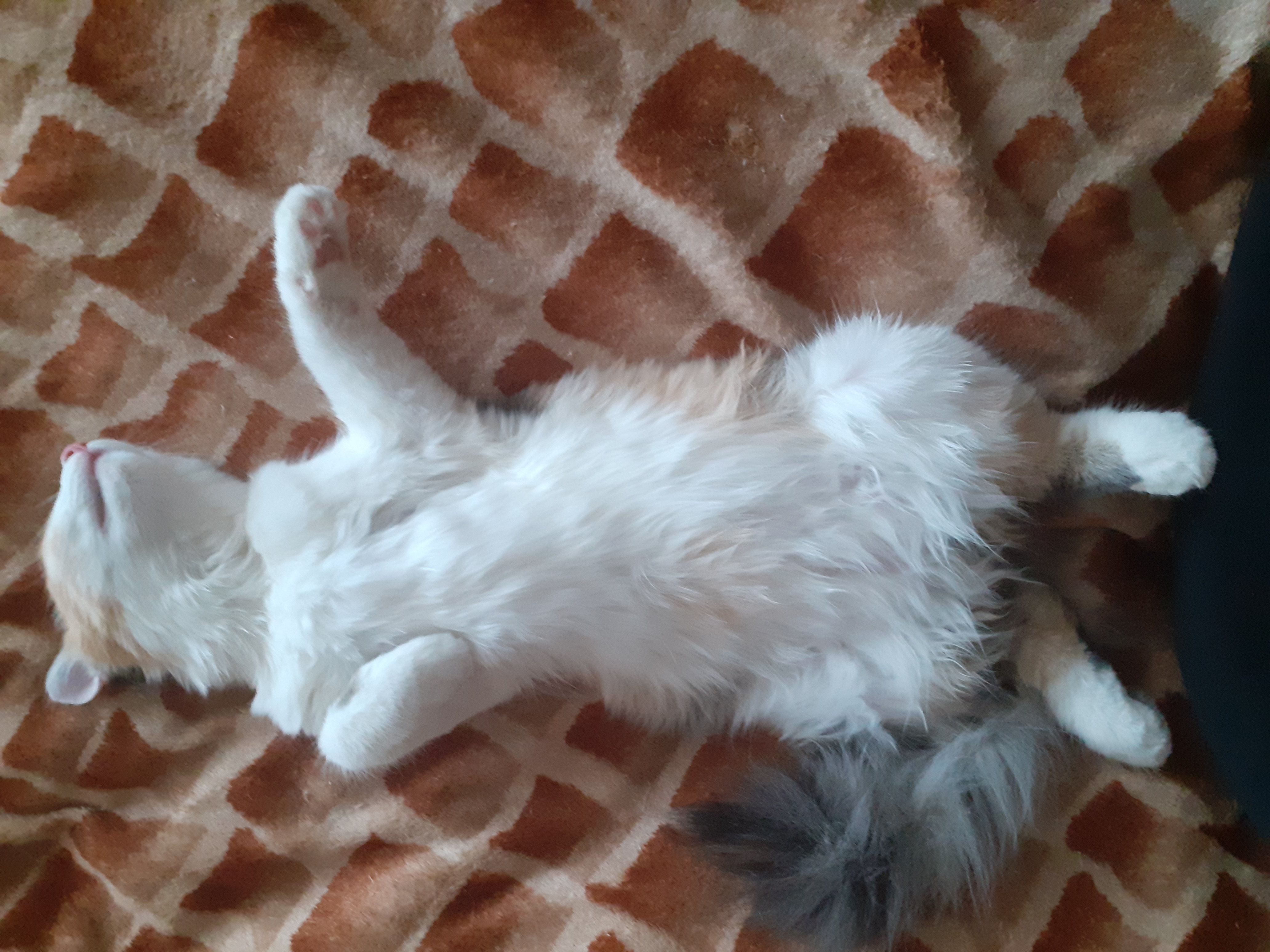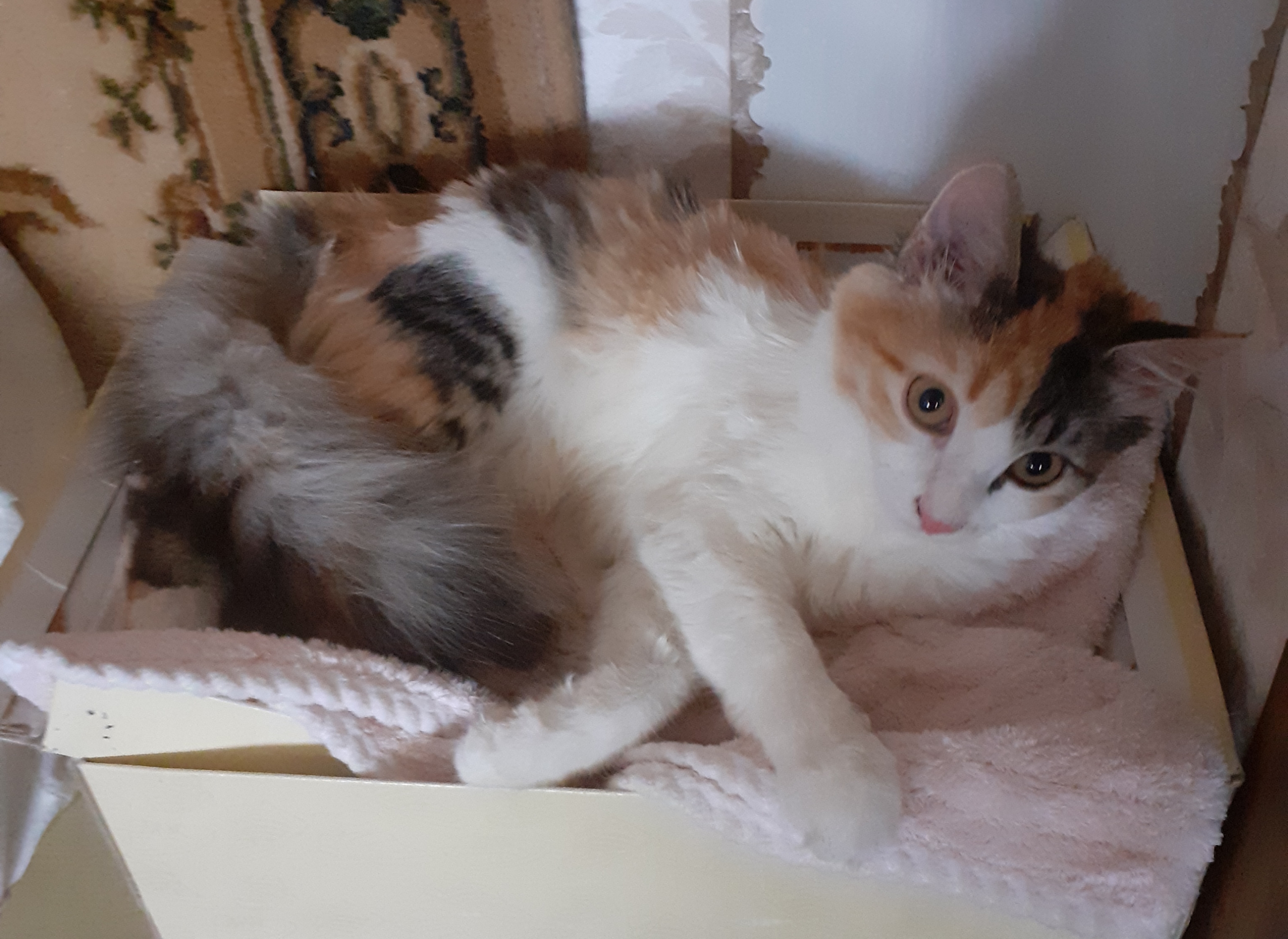 Мэри нашли у подъезда в листьях, совсем крошкой, сама кушать не умела, сейчас ей 5 месецев, очень ласкавая, идёт на руки сама и мурчит на всю квартиру