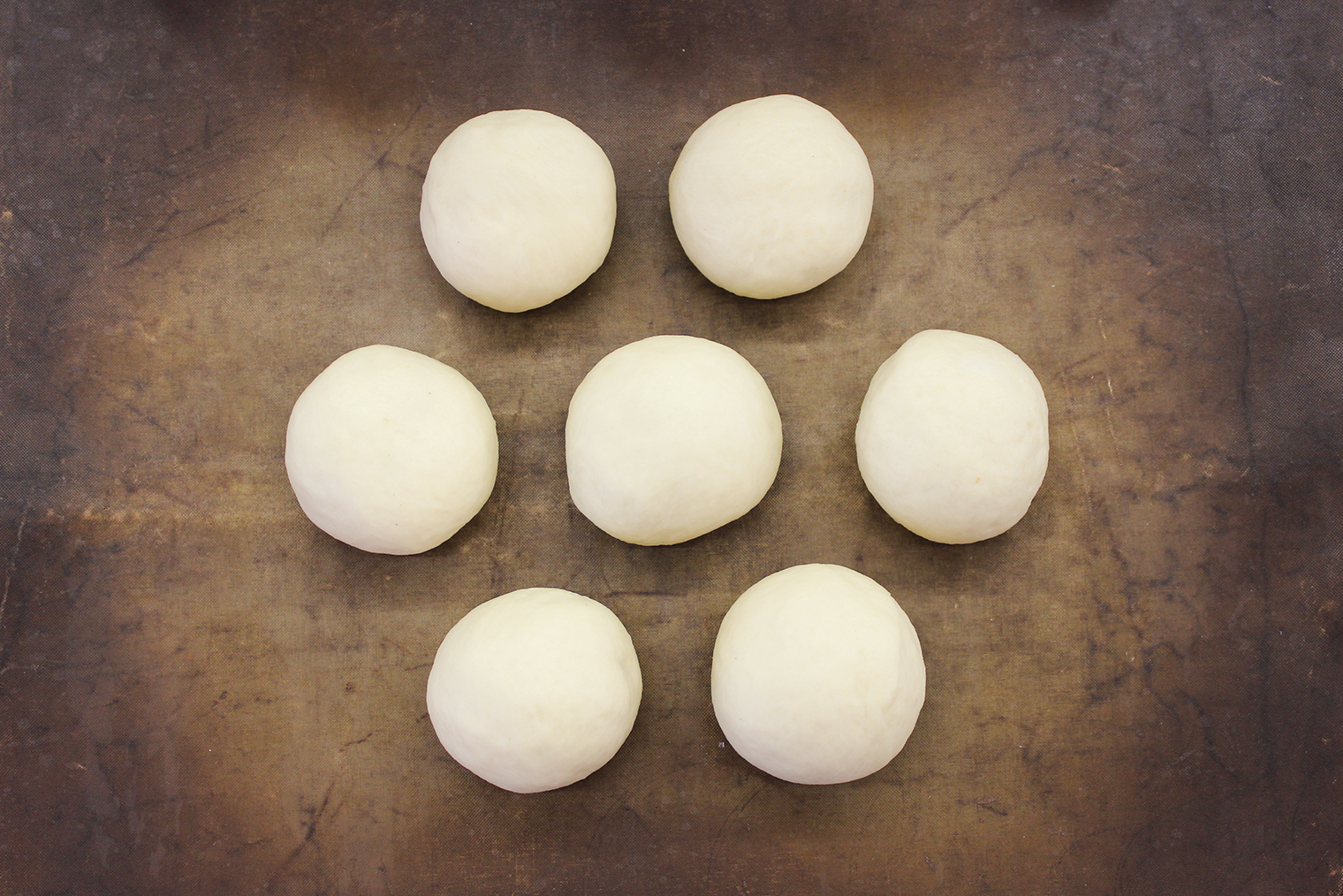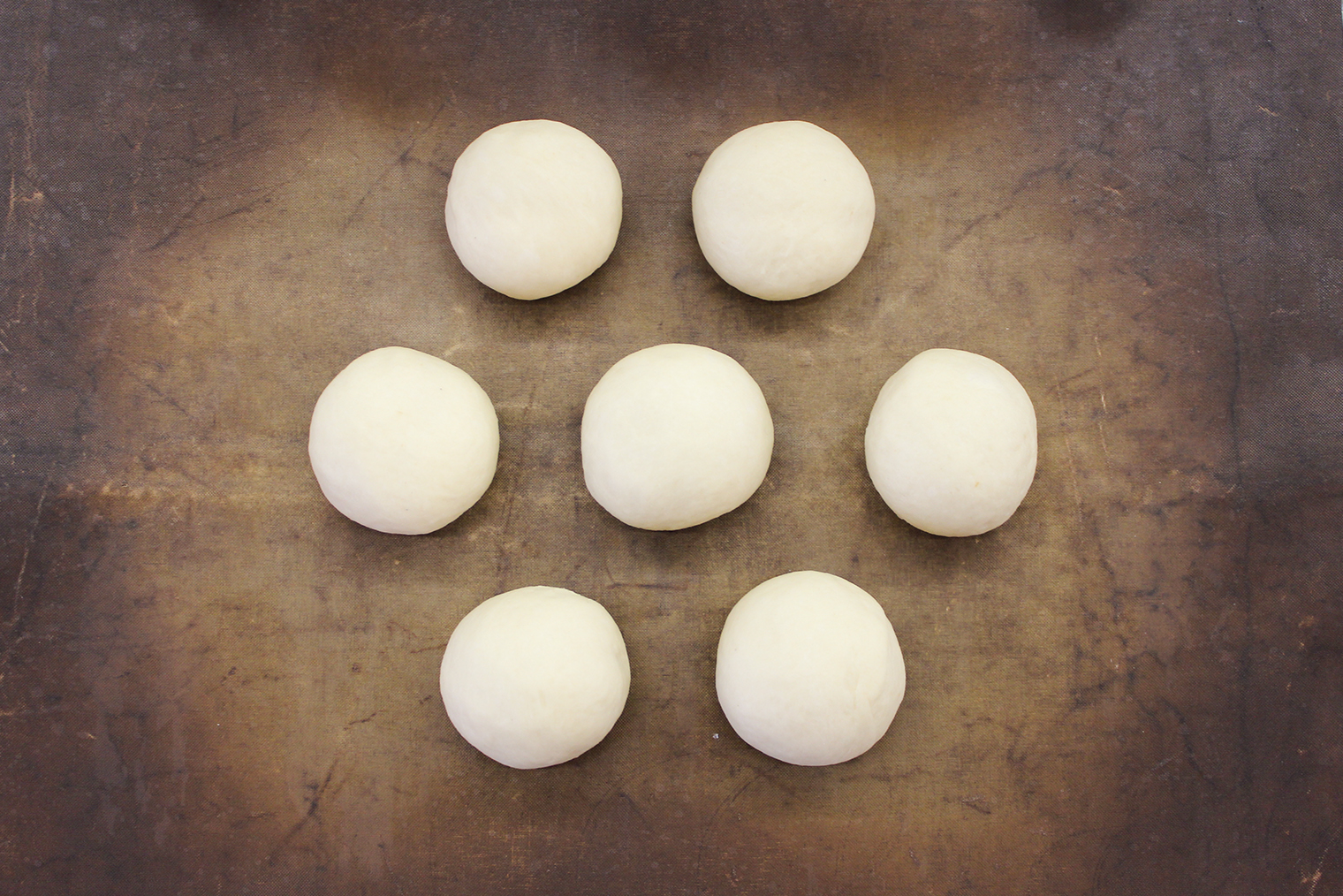 Шаг 5. Подошедшее тесто разделите на 7 частей по 56 г. Подкатайте их в колобки и выложите на противень с бумагой для выпечки. Накройте полотенцем или пищевой пленкой и оставьте на 20—30 минут.