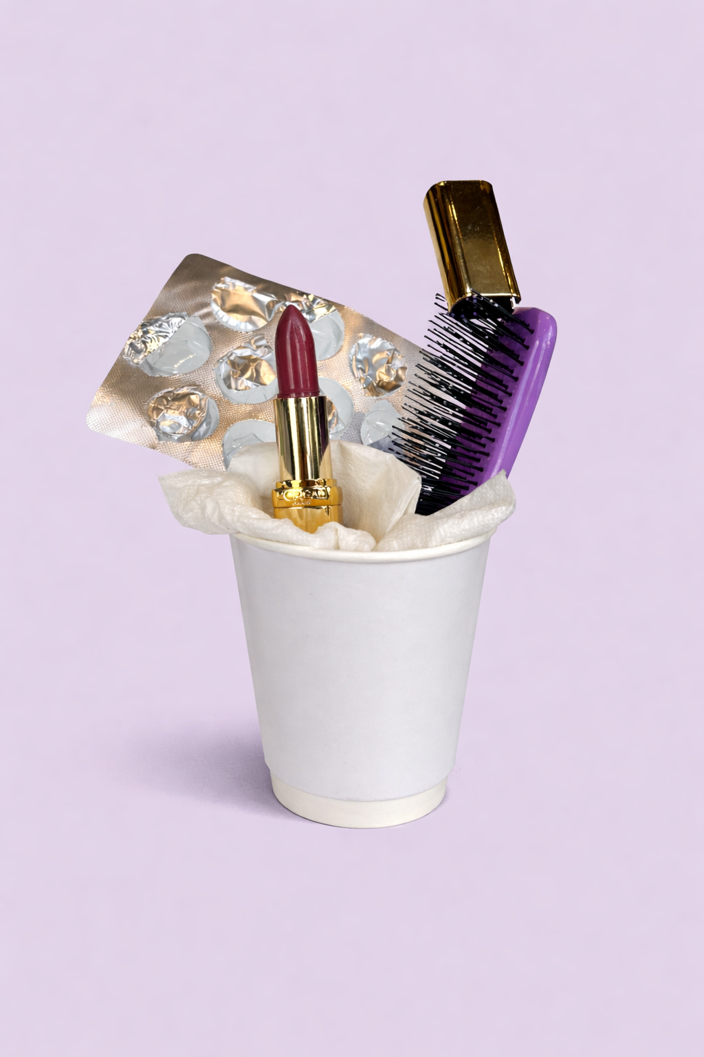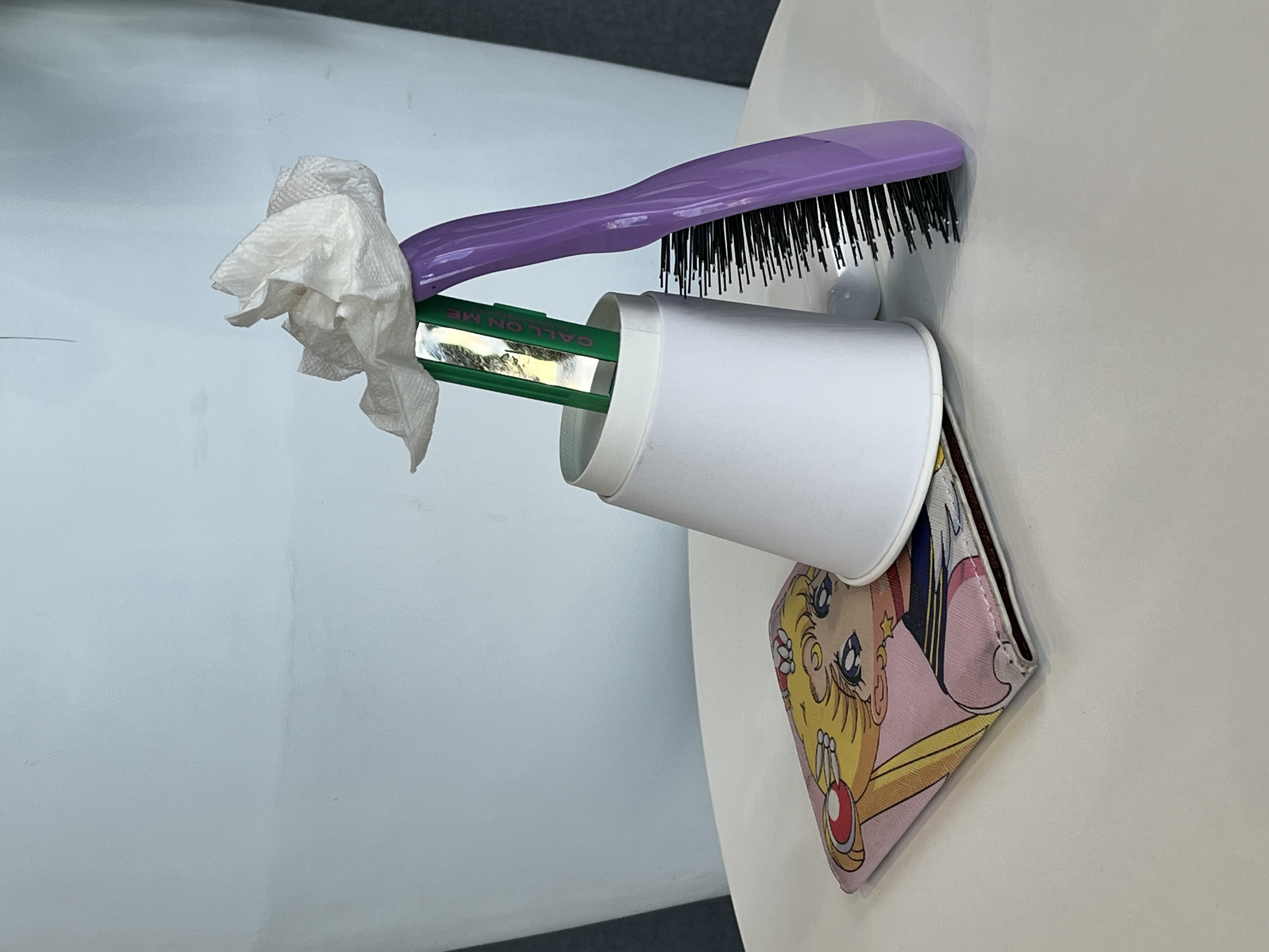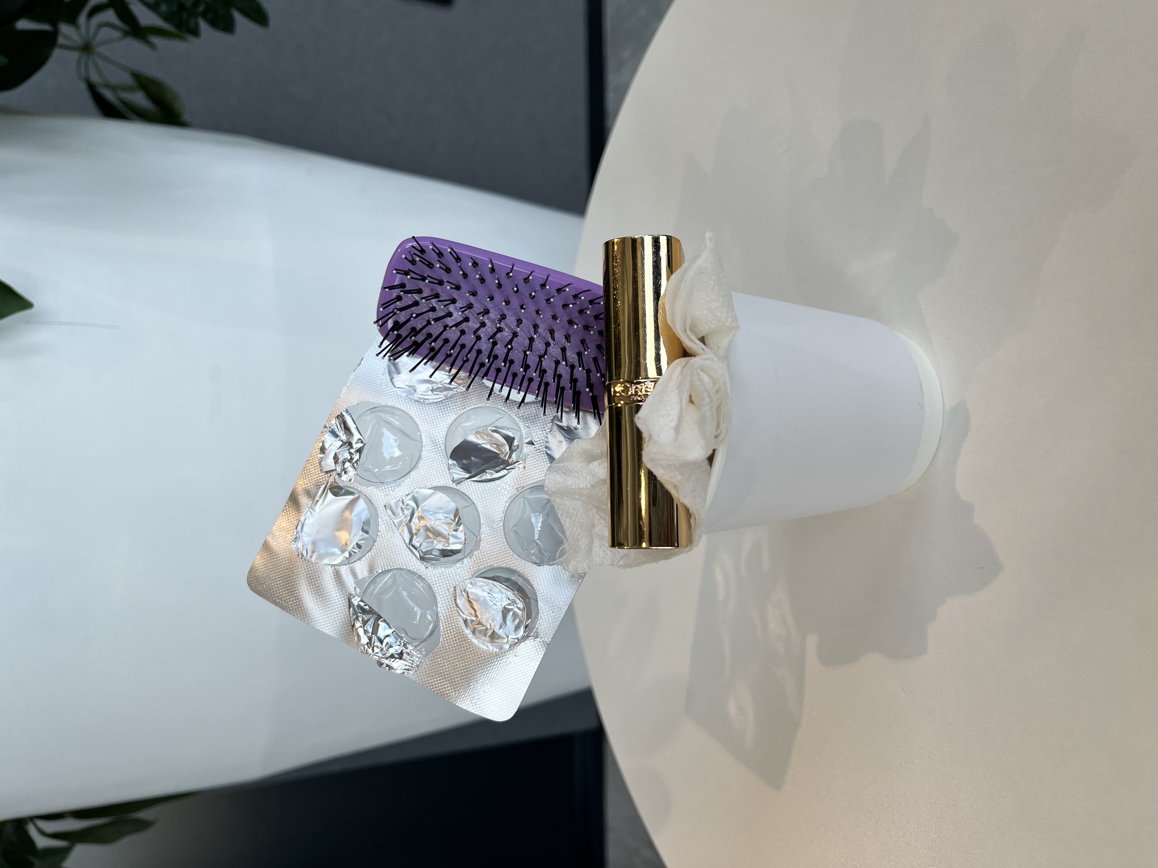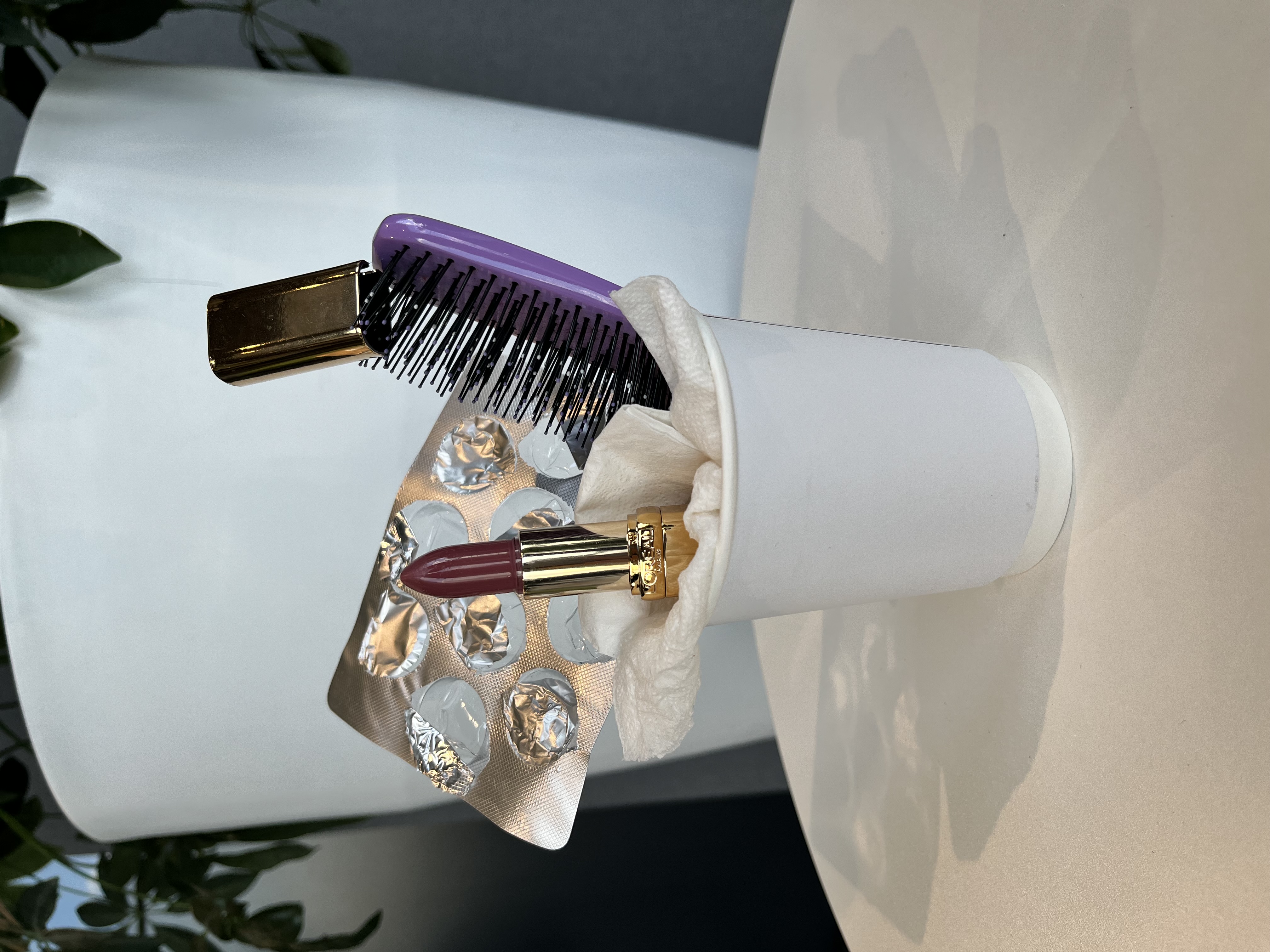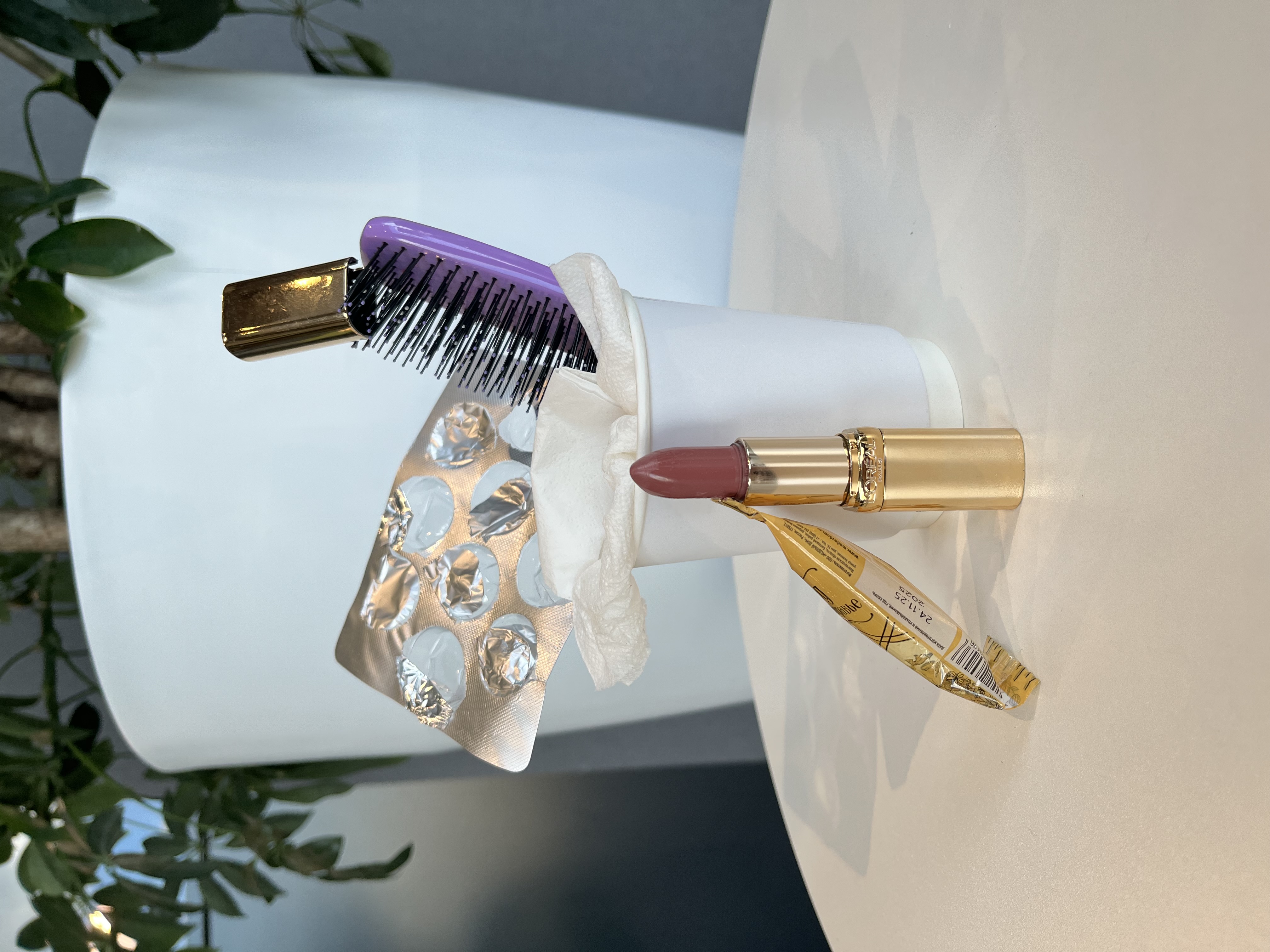 Но примеры от Ксении Михайловой были такие интересные и вдохновляющие, что я не удержалась и решила попробовать собрать хоть что-то из того, что было в моей сумке. Дополнила объекты находками из офиса: бумажным стаканчиком, одноразовым пакетиком меда и салфеткой.