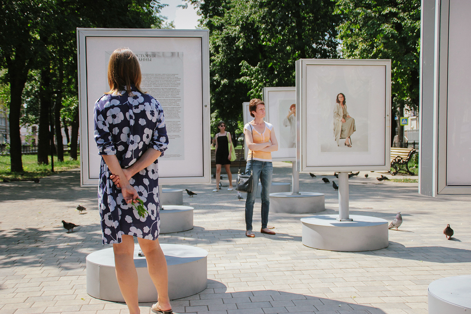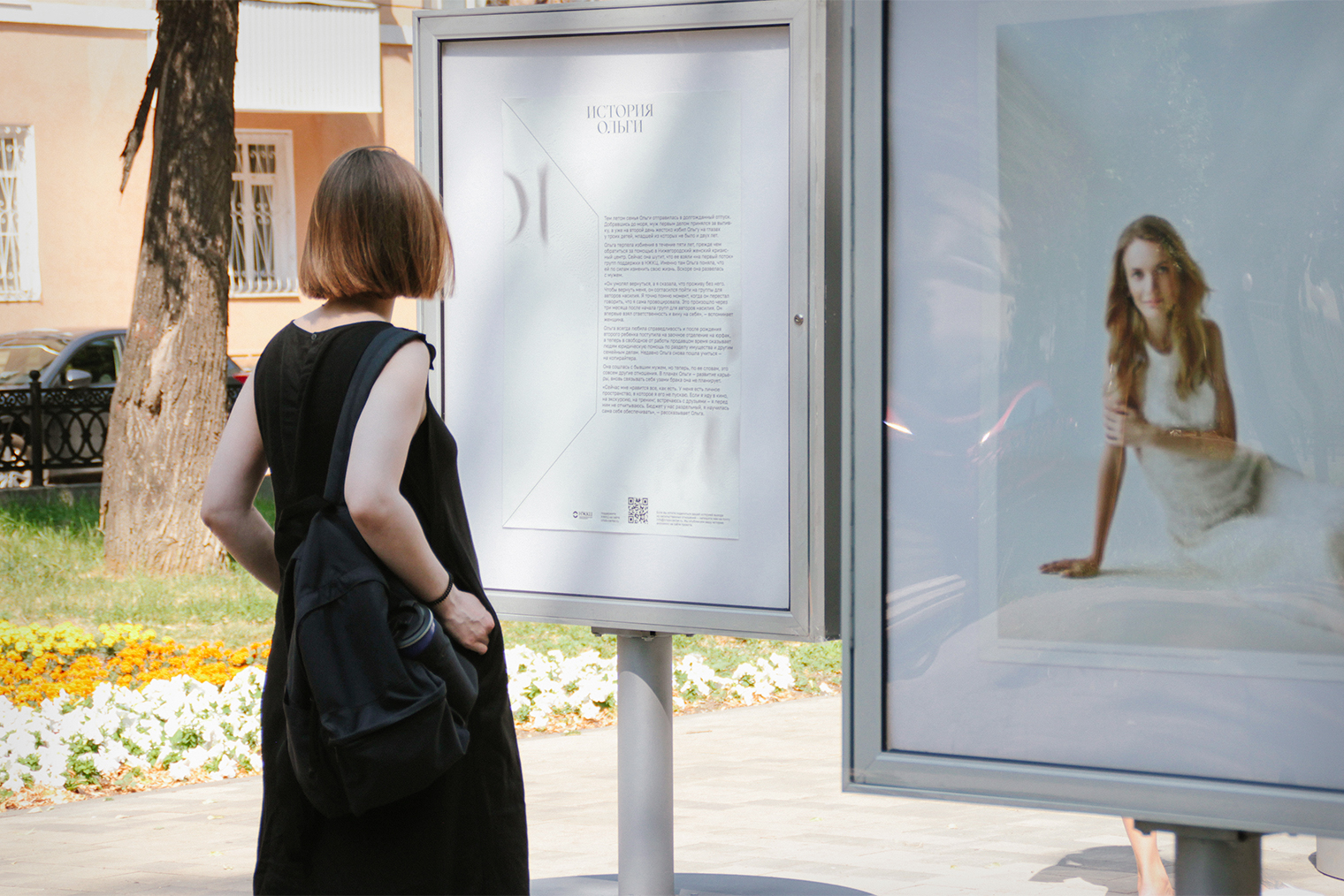 Выставка «Уходи за меня!». В 2022 году мы поставили в центре Нижнего Новгорода стенды с портретами женщин в стиле глянцевого журнала и их историями, резко контрастирующими по настроению. Все героини вышли из абьюзивных отношений, в том числе благодаря поддержке НЖКЦ.
