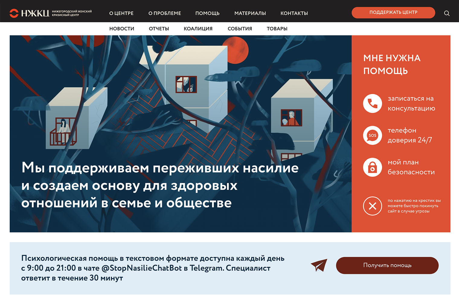 Героиня этого текста Дарья занимается коммуникациями в Нижегородском женском кризисном центре, который помогает пострадавшим от насилия. НКО предоставляет психологические консультации по телефону или в телеграм-чате, устраивает очные и онлайн-группы поддержки, оказывает юридическую помощь.