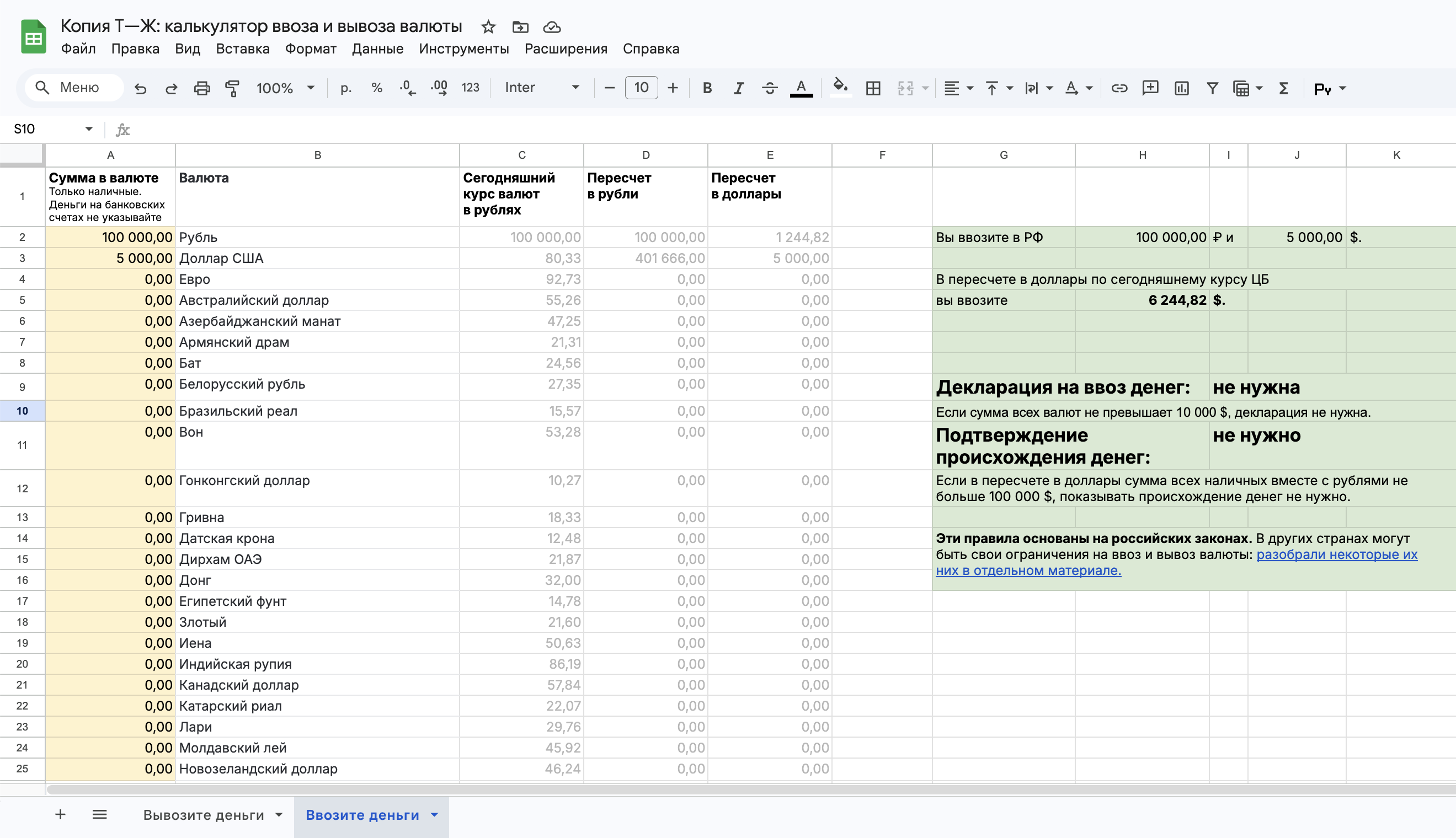 Это можно сделать при помощи таблицы, которую составил Т—Ж. Она подтягивает актуальный курс валют с сайта Центробанка на день обращения, поэтому при первом открытии надо разрешить брать информацию из внешнего источника и немного подождать, чтобы данные обновились. Выберите вкладку «Вывозите деньги» или «Ввозите деньги», укажите в желтой колонке, сколько и какой валюты вы берете, — и увидите результат.
