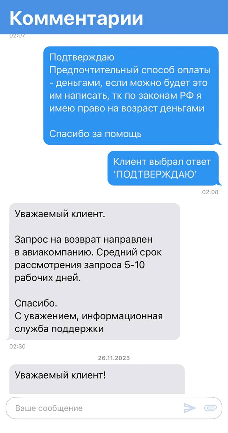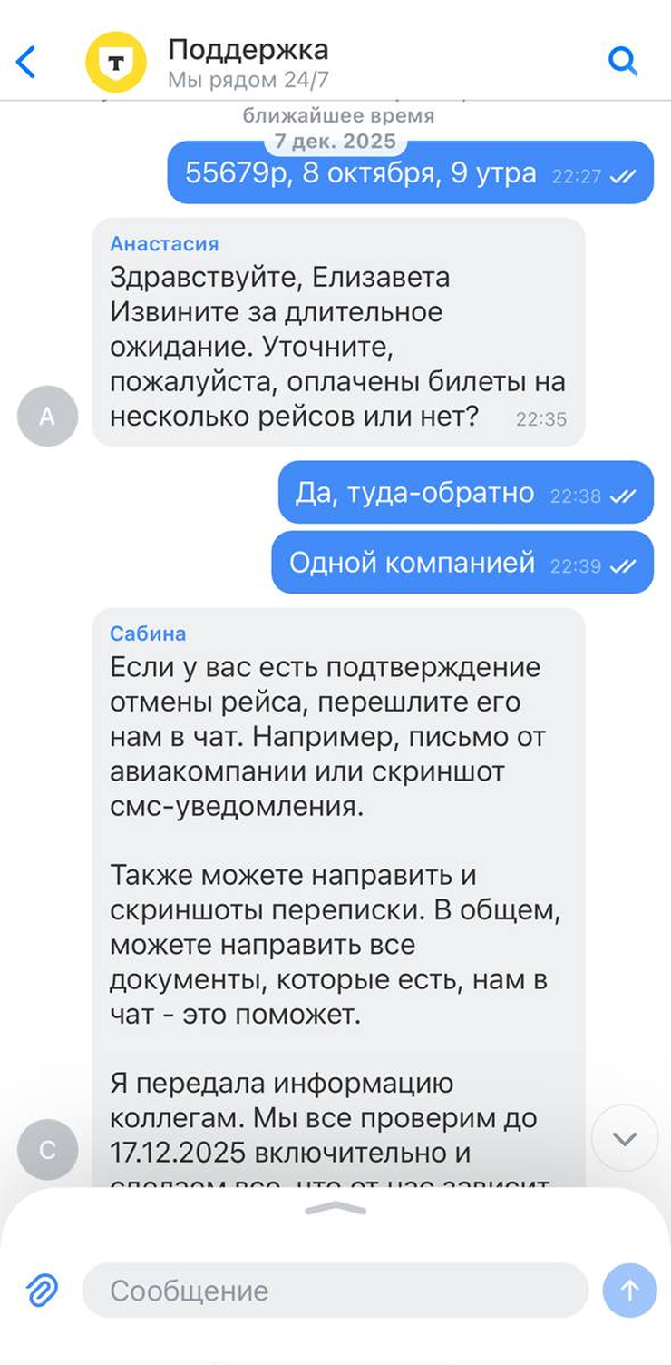 К обращению прикрепила скриншоты переписок с агрегатором. Дополнительно у меня спросили, почему возвращаю деньги за билеты в обе стороны. Тогда пояснила, что купила их единым билетом и из-за этого потеряла всю сумму, когда первый рейс отменили.