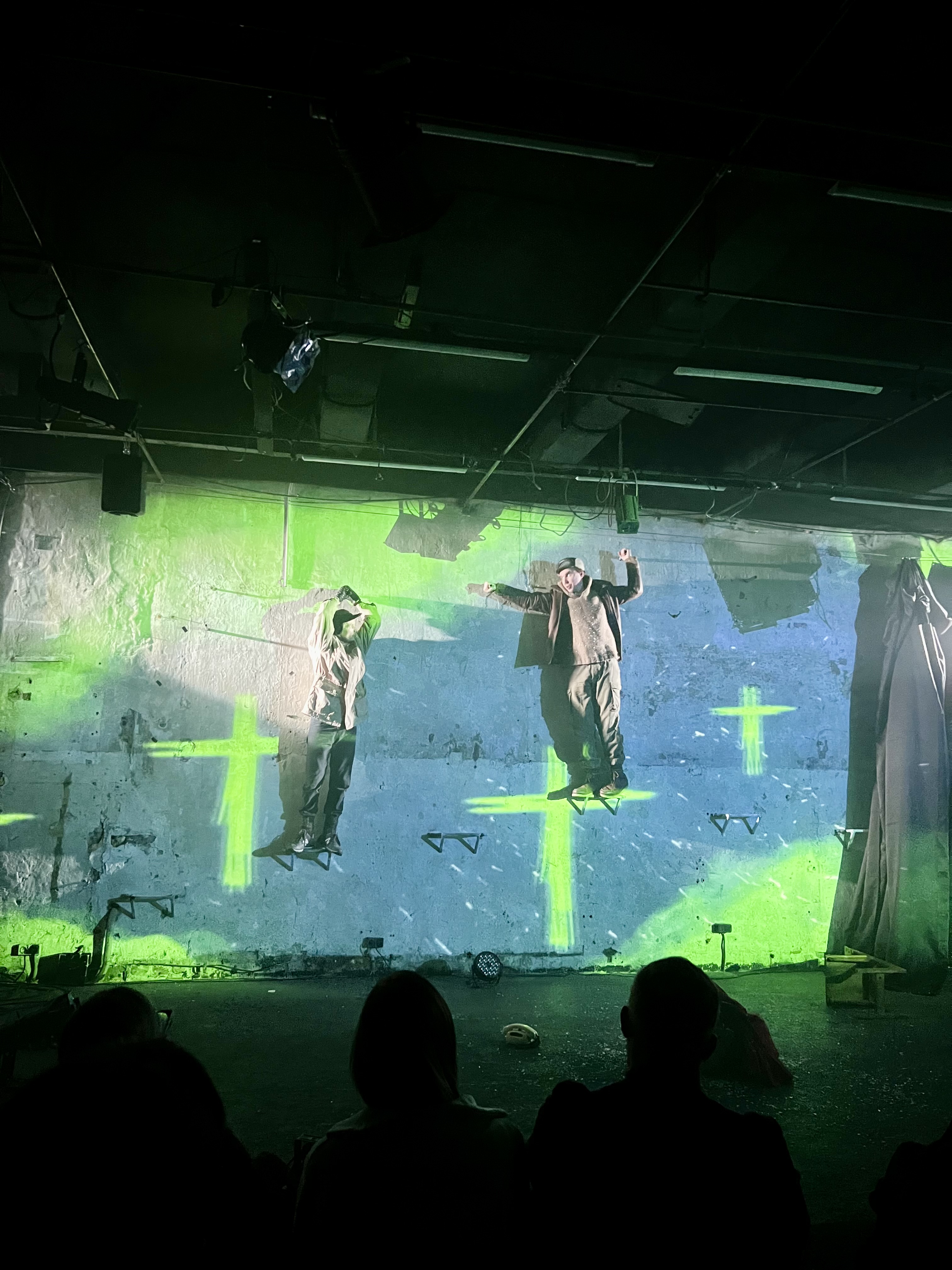 Чуть больше часа на одной сцене два персонажа: Василь (Олег Рязанцев) за старшего и Костян (Михаил Касапов) за того, кто напуган и растерян сильнее. Они остались наедине не только с холодом, но и с тишиной, пустотой, внутренними тревогами и.. смертью, не просто приближающейся, но следующей за ними.