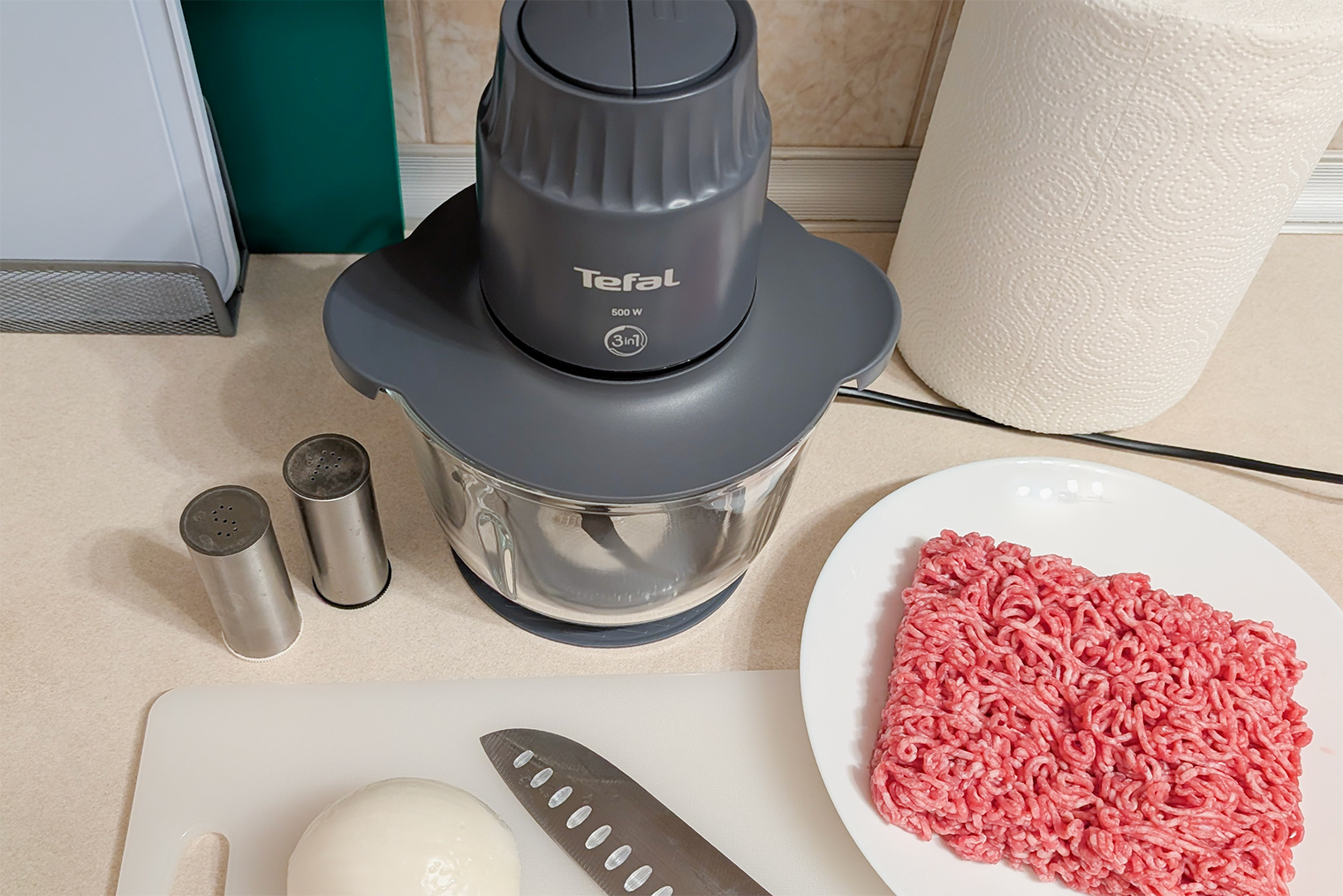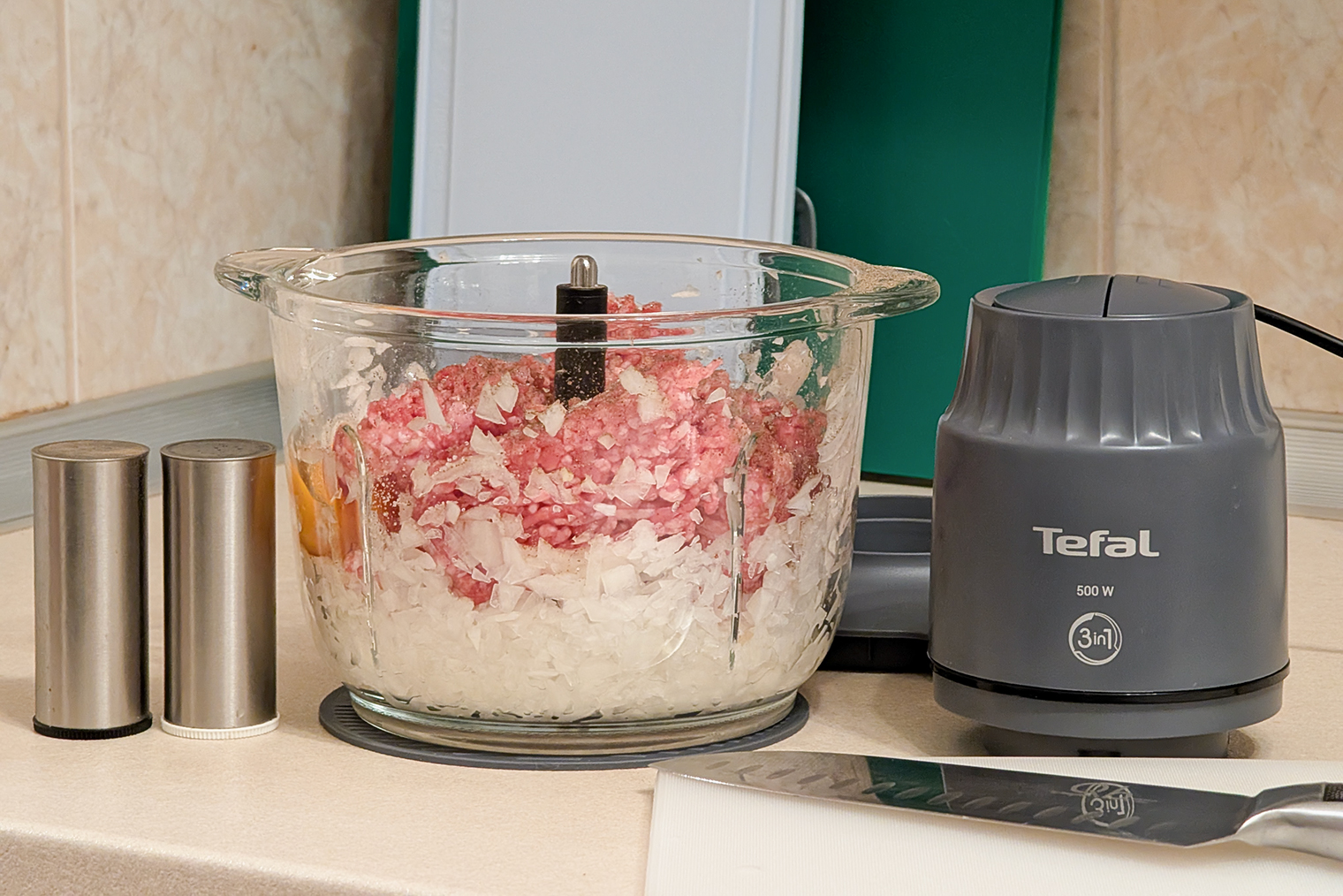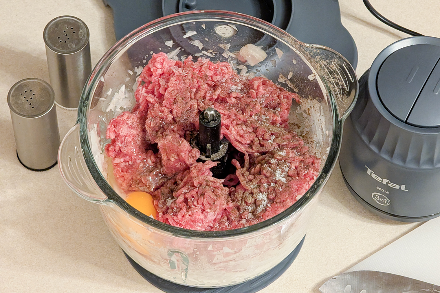 Мой типичный сценарий — котлеты. Режу лук на четвертинки, кидаю в чашу и включаю первую скорость. Измельчитель быстро выводит лук в пюре без крупных фрагментов. Потом добавляю мясо — иногда даже полузамороженное, если нужно готовить прямо сейчас. Добавляю яйцо, соль, перец и включаю вторую скорость примерно на 10 секунд. За это время масса становится однородной.