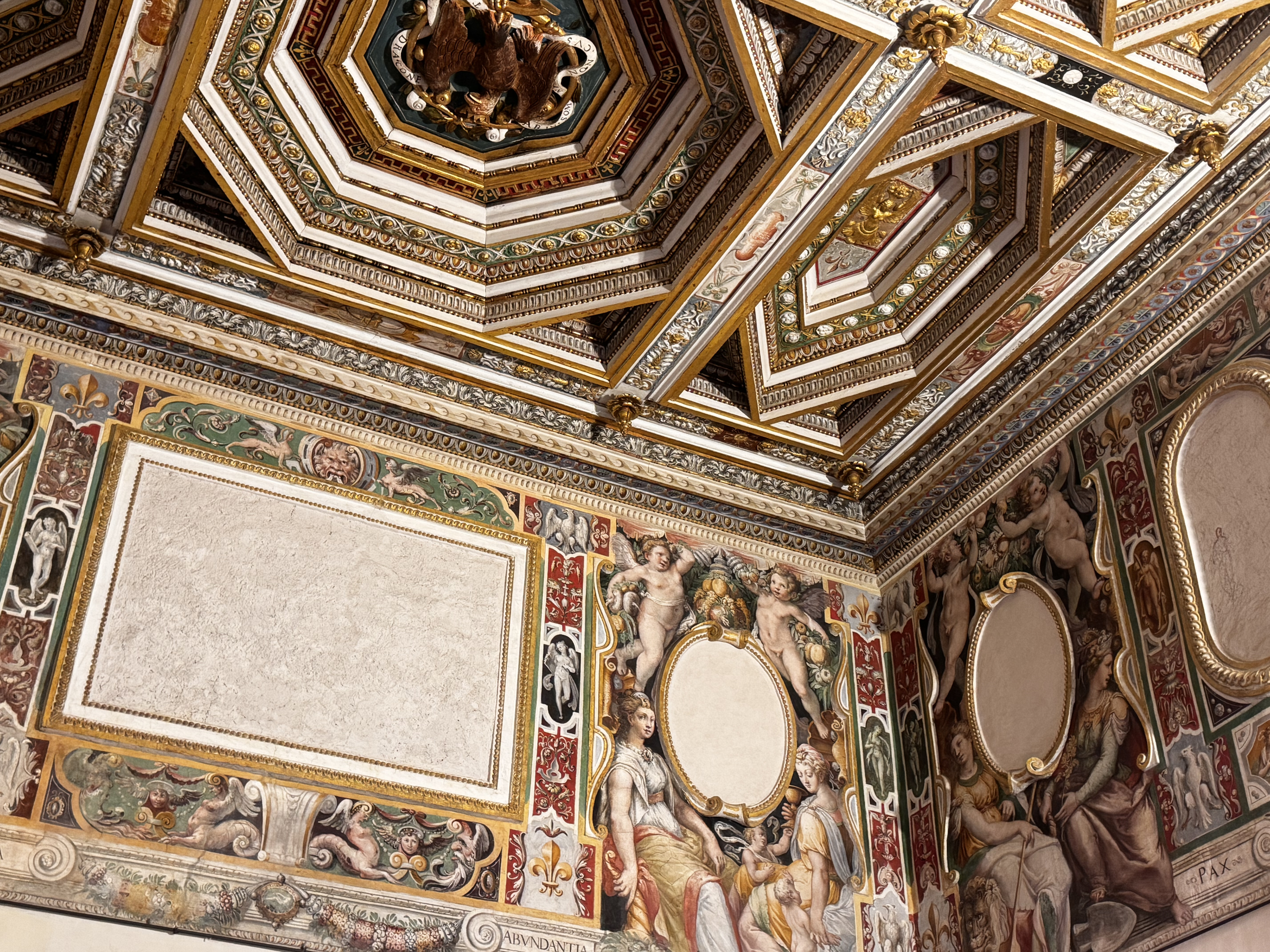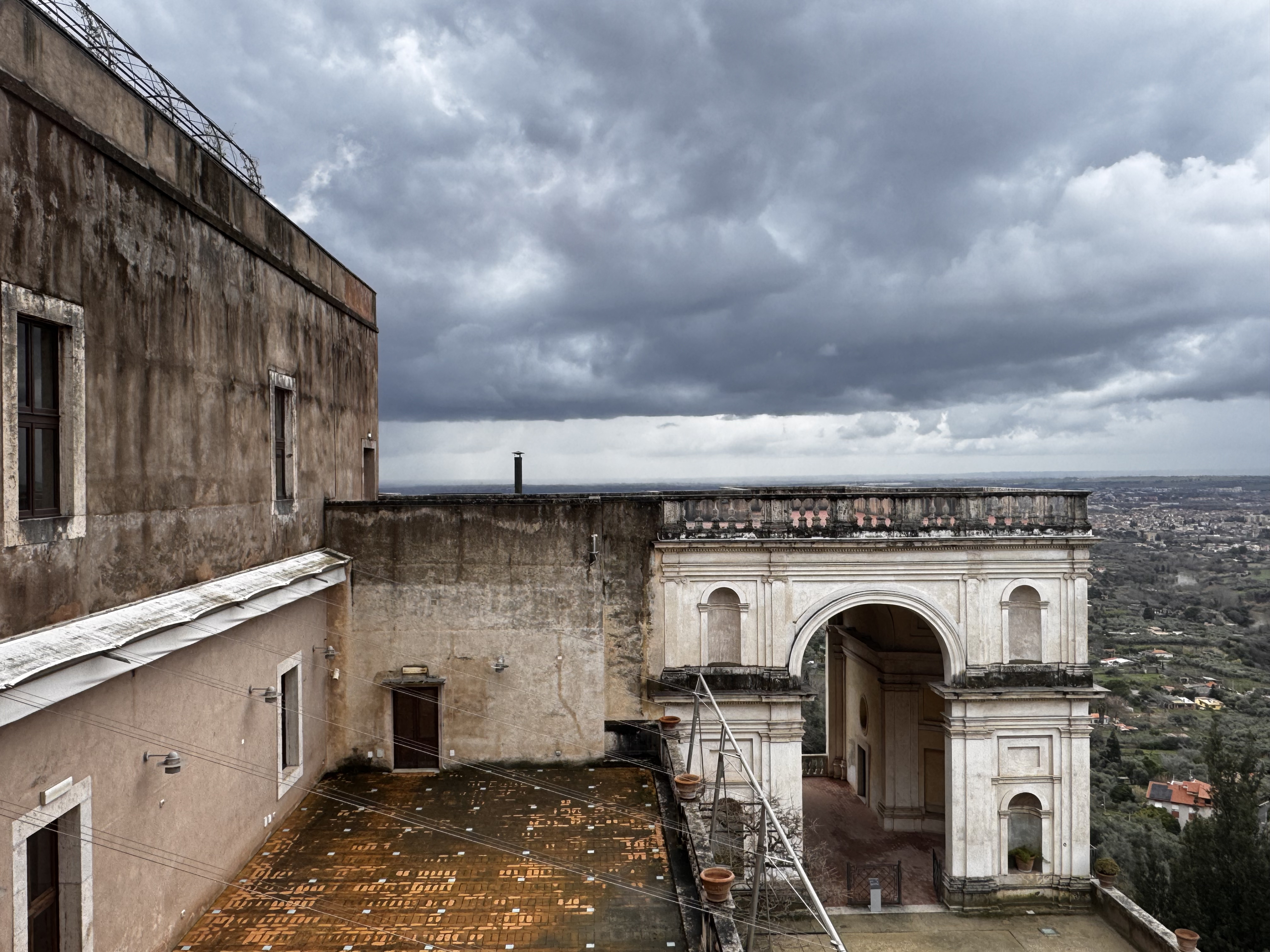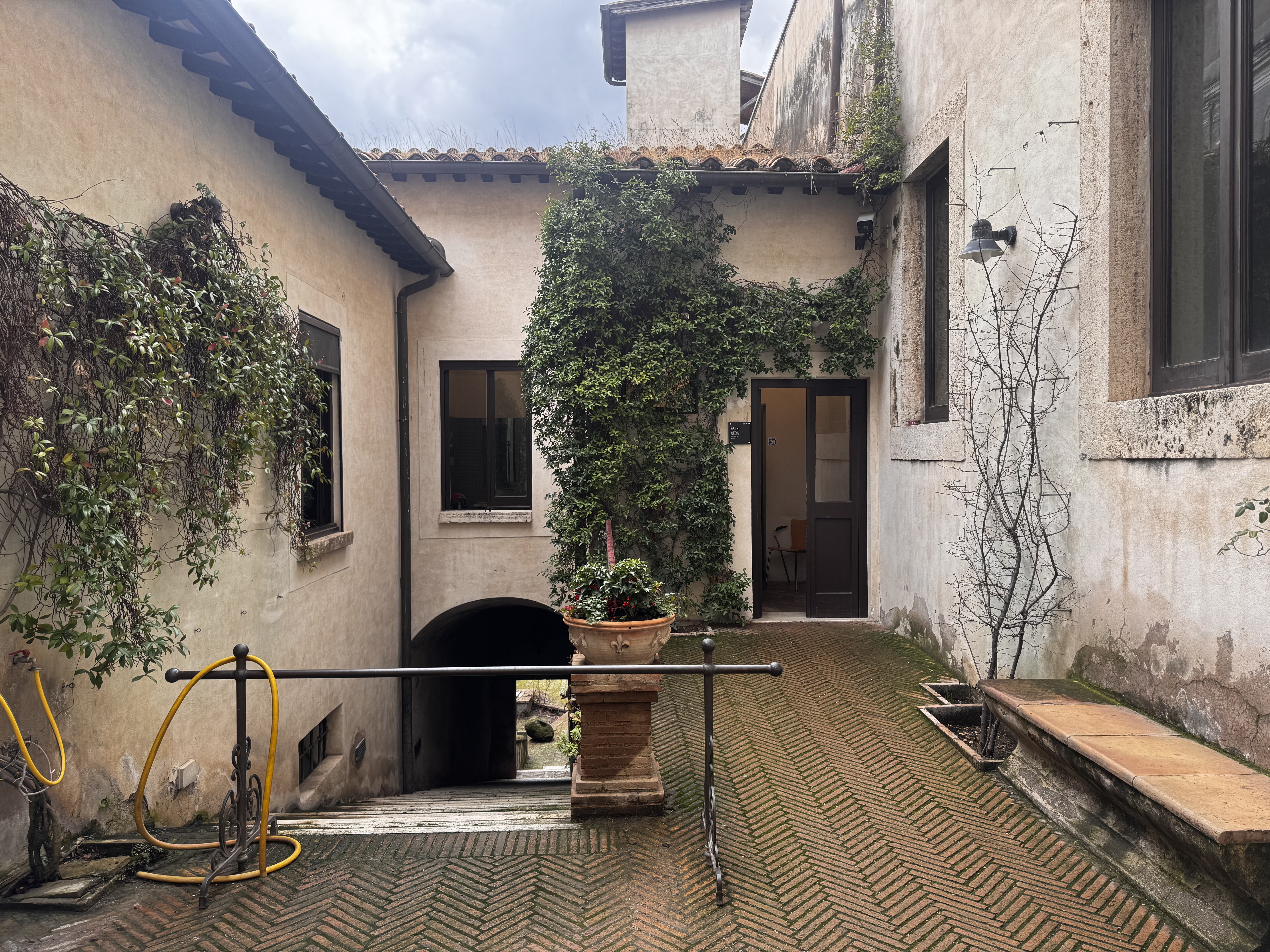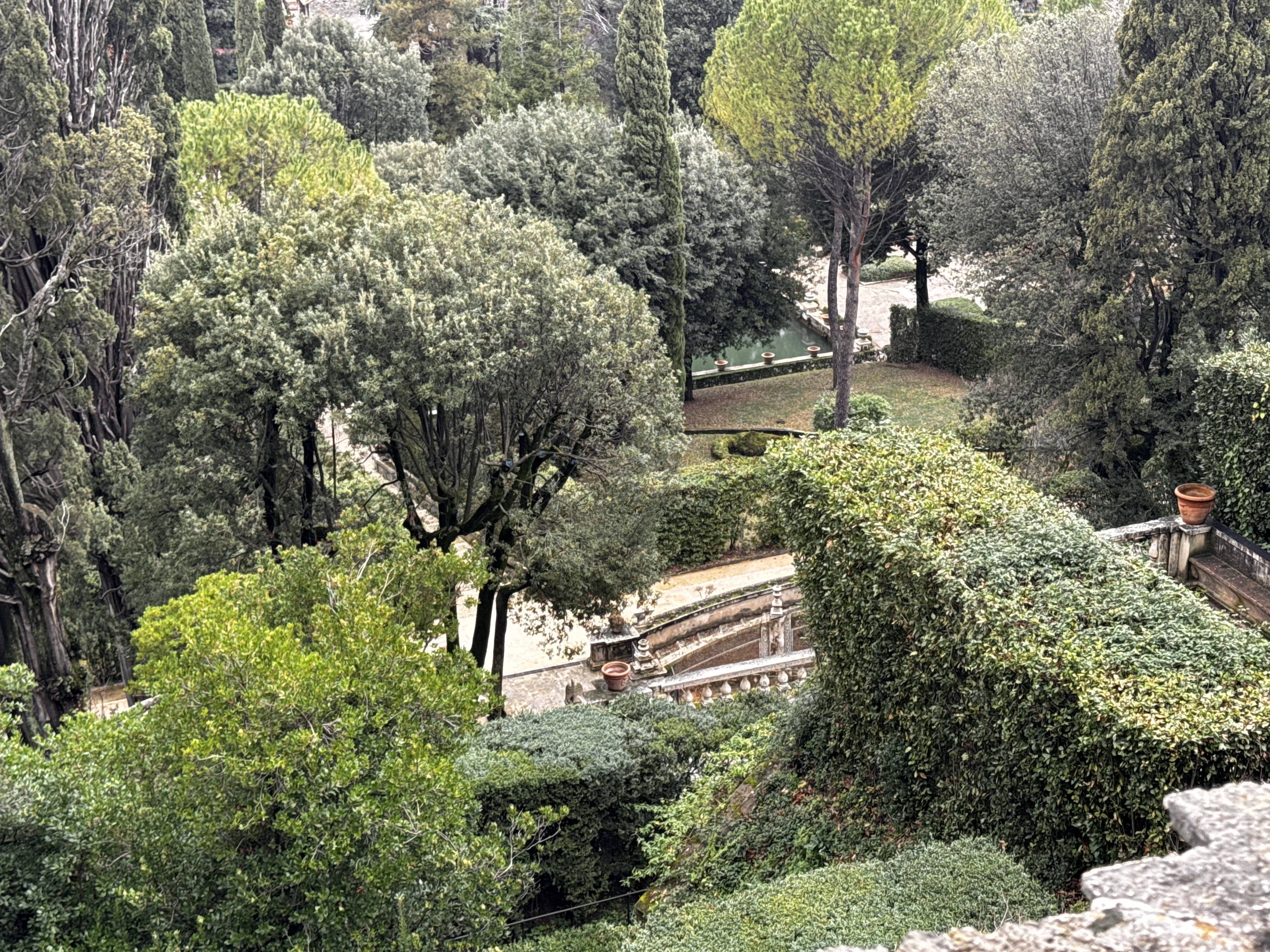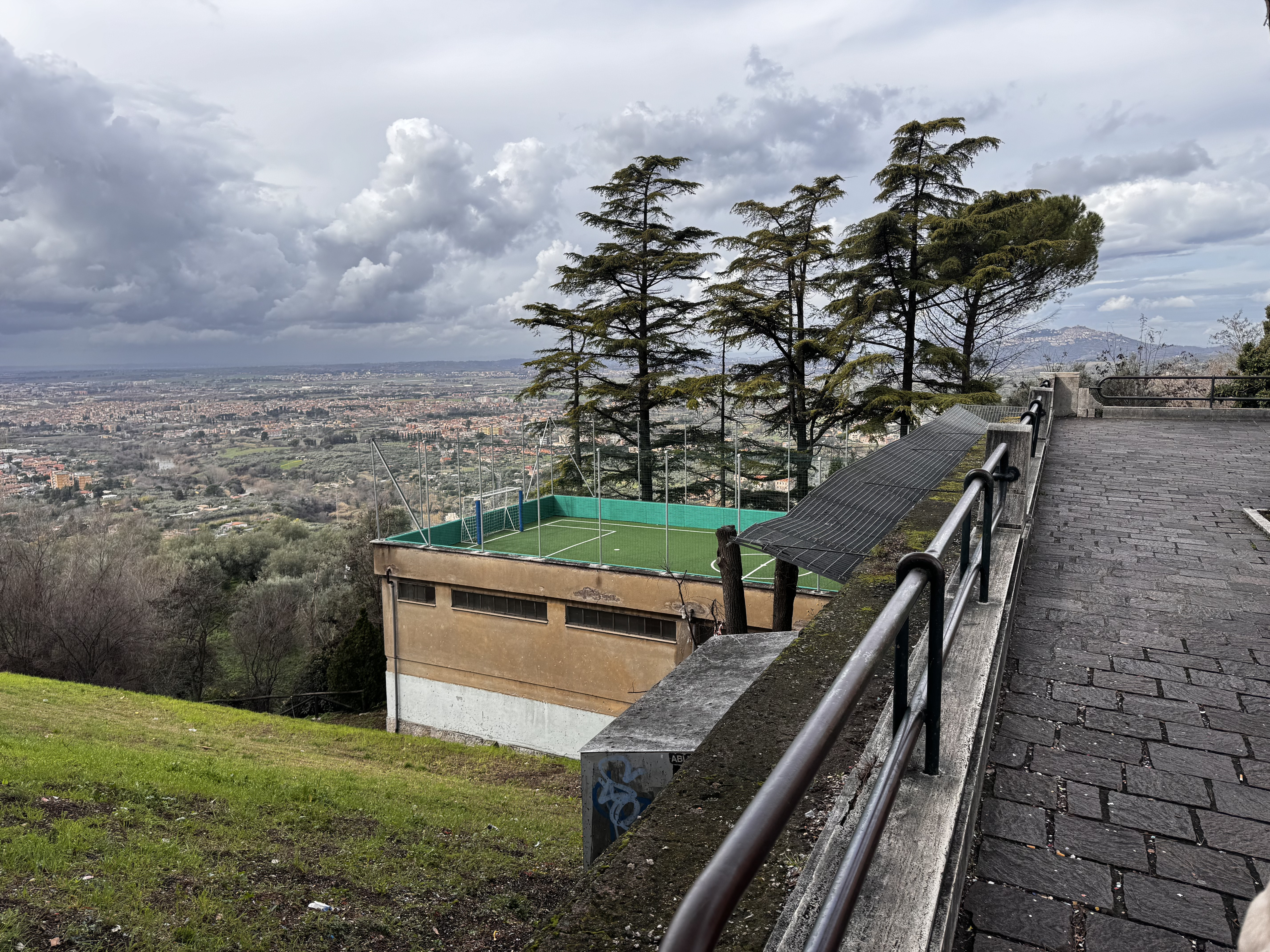 Во всех подобных музейных комплексах в Италии туалеты — это не отдельная современная постройка во дворе. Это часть самой исторической усадьбы. Под них отдают помещения внутри. Всё чисто, камерно, аккуратно. И, поскольку Италия — страна курящая, пепельницы стоят буквально везде, даже на территории музея. Представить такое у нас сложно. Внутри — классический палаццо Италии: фрески, резные потолки, лепнина в таких объёмах, что понимаешь: это уже не просто вилла, это дворец. Всё сделано на века. Из окон — т вид на Тиволи, плотную застройку на холмах. Италия действительно застроена очень плотно. На склоне — футбольное поле. Дети, правда, не играли.