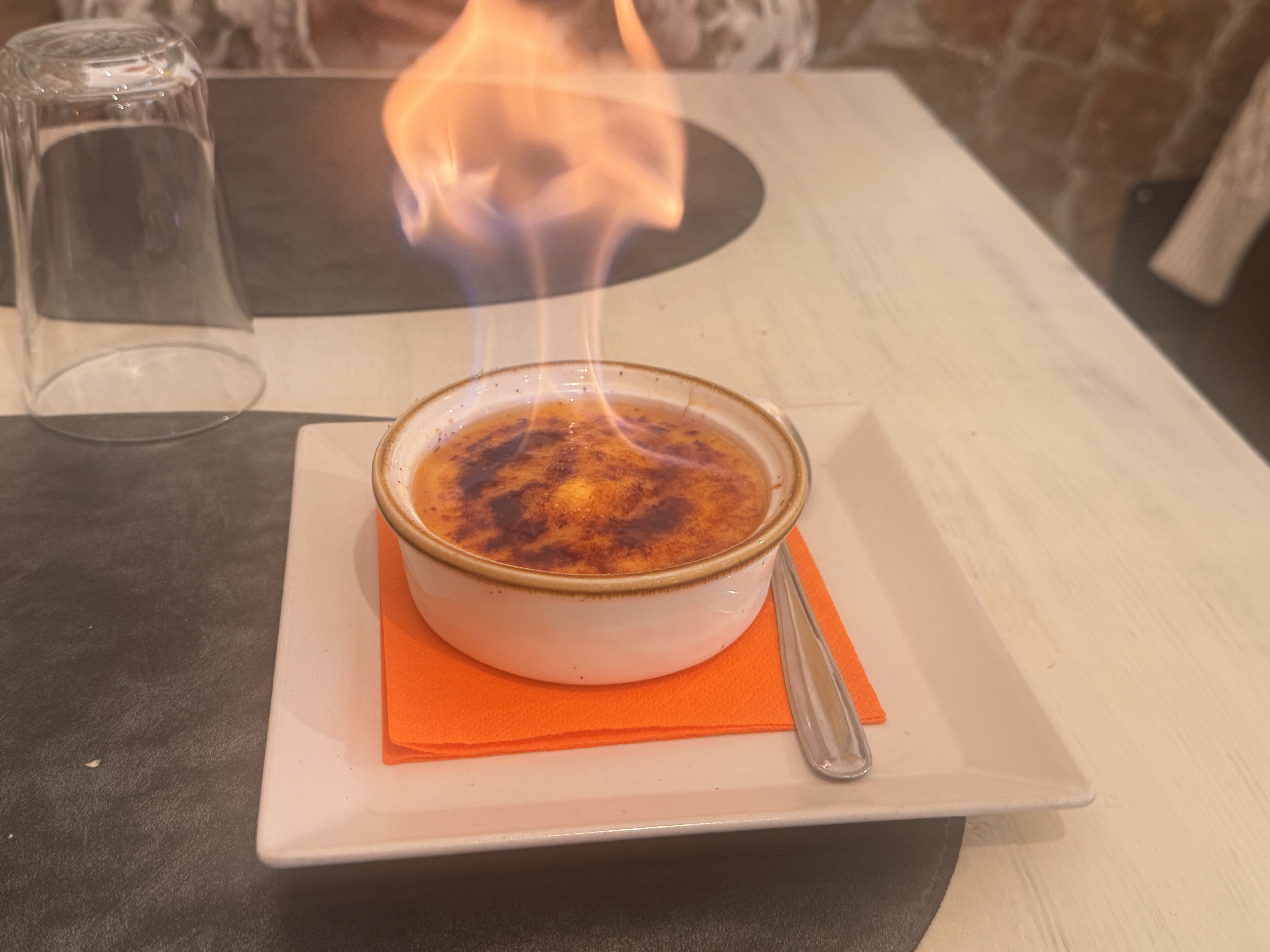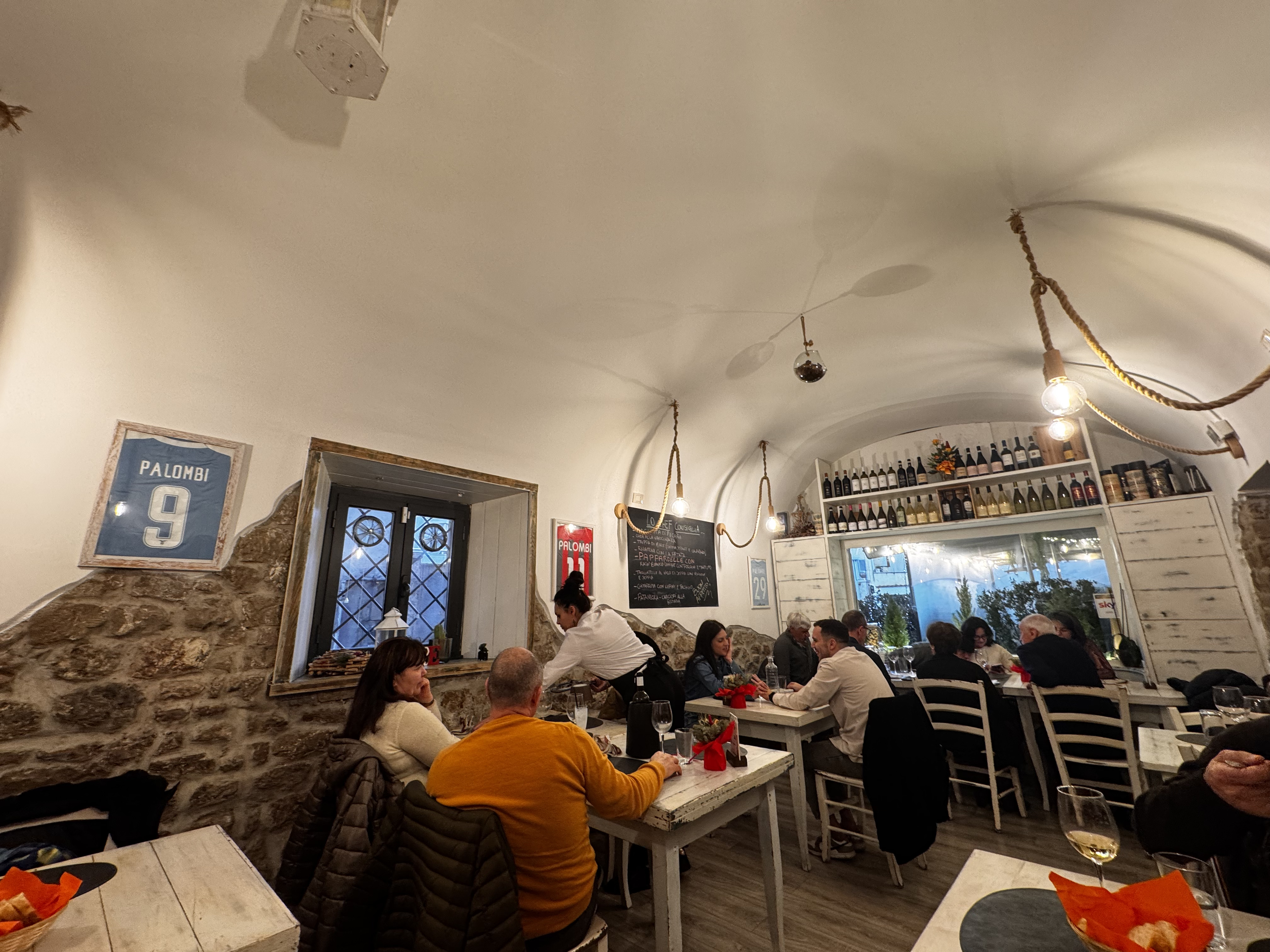 Пошли есть. Нашли испанскую остерию Mom. Почти без туристов, только местные. Жареный осьминог — 15 евро, паста — до 20 евро, бокал вина — 6 евро (и это 250 мл, надо помнить). Взяли тальяту — тонко нарезанную говядину со специями. Огромная порция, мясо мягкое, лучшее что пробовали в Италии. Спагетти с морепродуктами — более скромно. Десерты по 6–7 евро. Лимонный кейк обжигают при подаче. Белое вино Terra Nostra, Фаланкина — достойное.