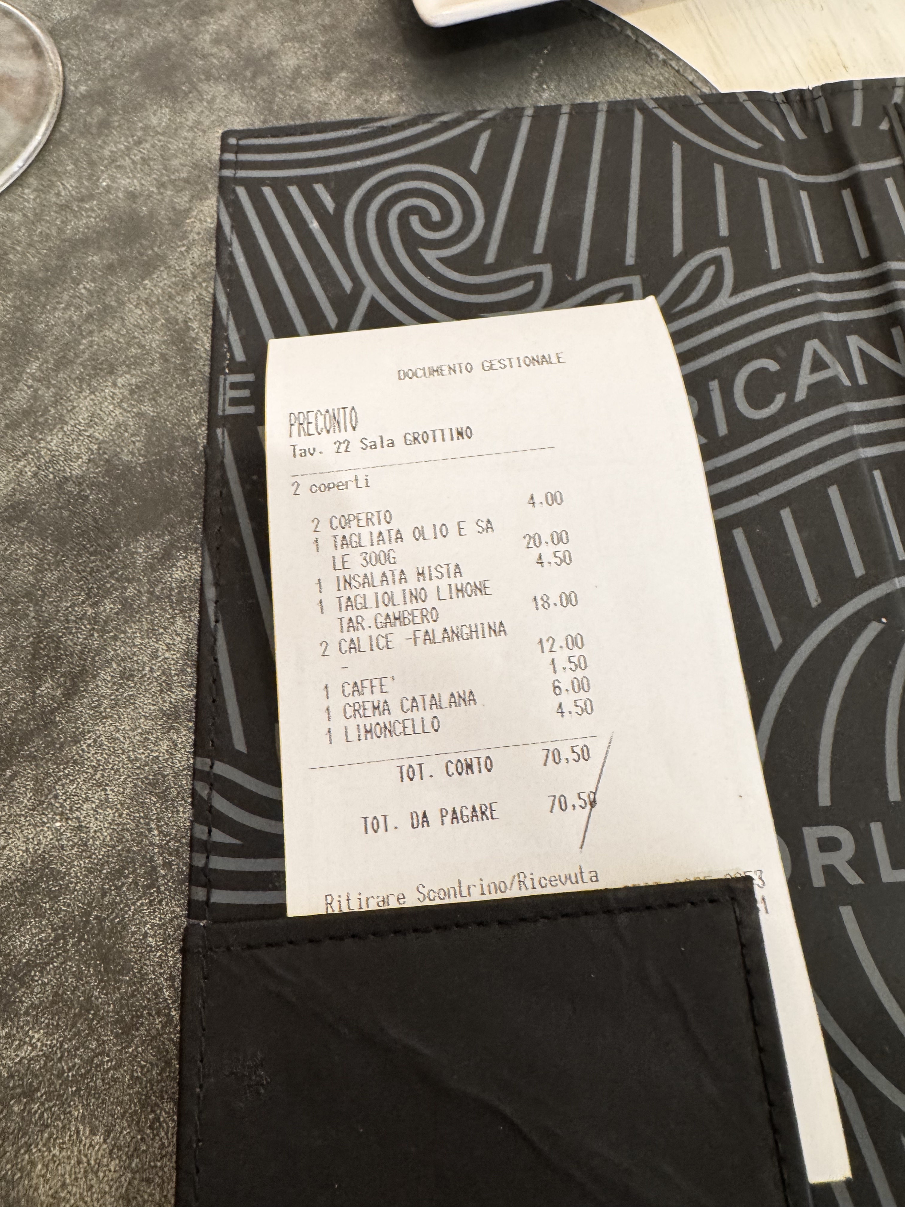 Счёт вышел 70 евро. И плюс coperto — 2 евро с человека просто за обслуживание. Важно помнить что это Италия, и считайте за 2 блюда, закуску, напитки и десерт это почти за даром.