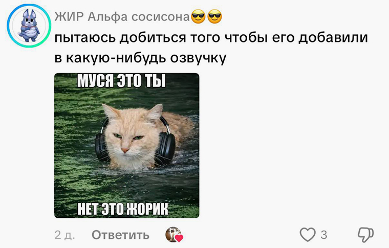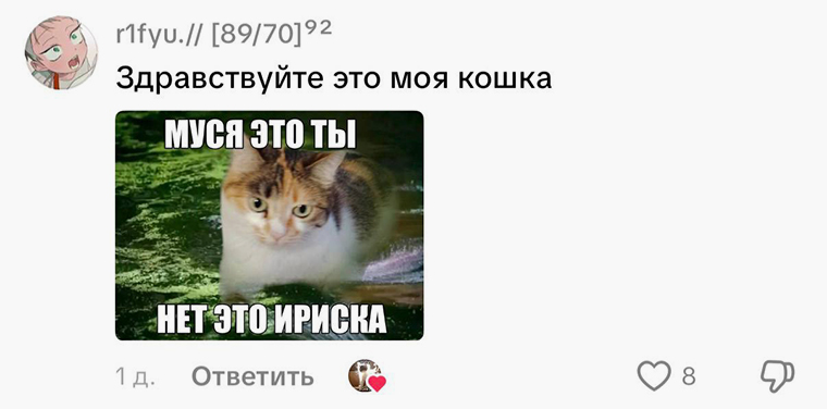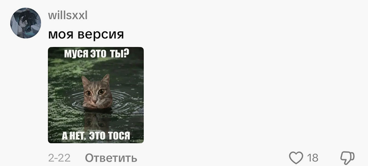 При этом в комментариях пользователи часто публикуют фотографии своих котов, делая из них альтернативные версии картинки. Чаще всего они призывают зафорсить своего питомца и превратить его в полноценный мем наравне с Мусей.