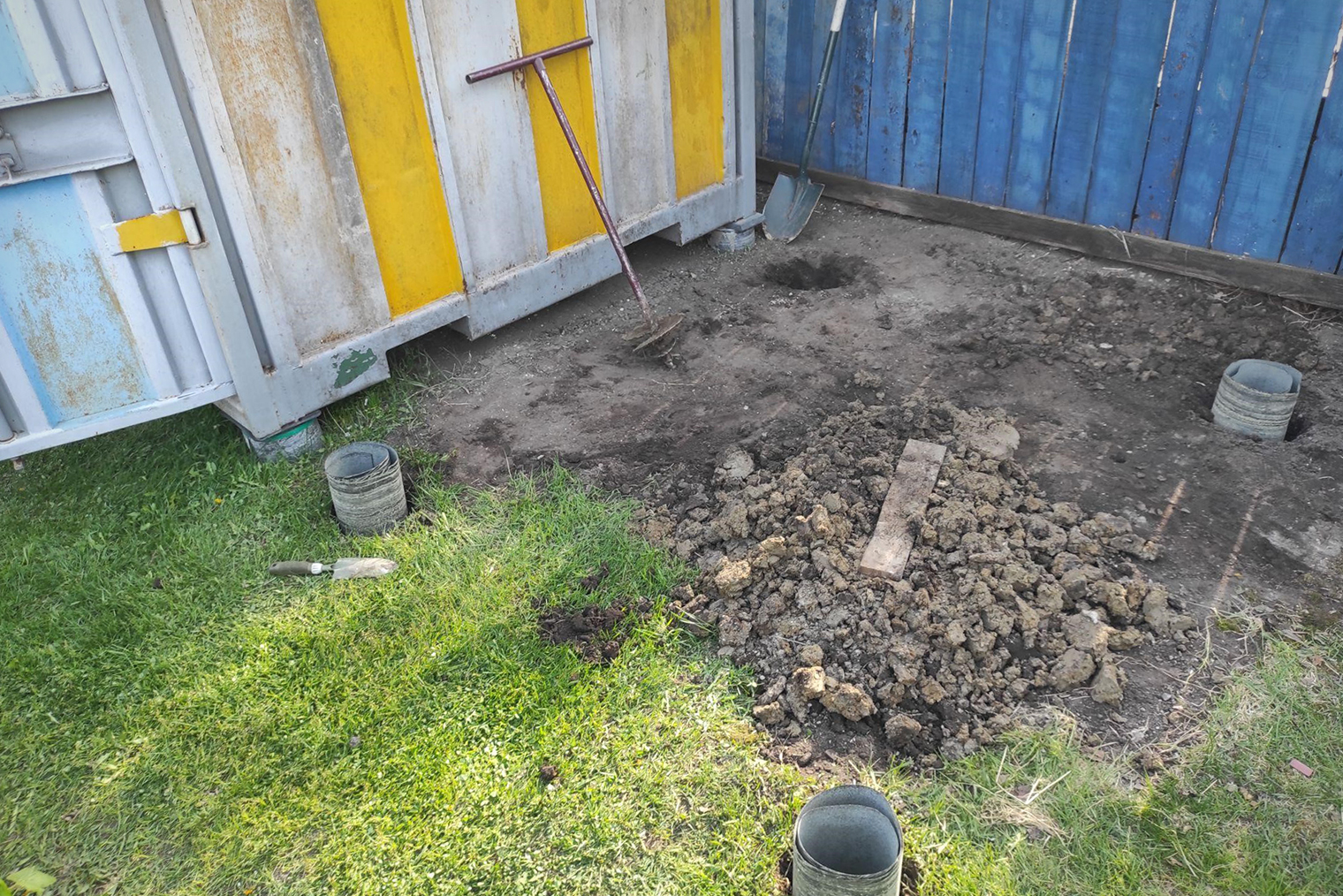 На этот раз я расчистил место справа от контейнера и приступил к бурению лунок под сваи. Изначально хотел сделать хозблок размером 2 × 2 м и для этого пробурил четыре лунки.
