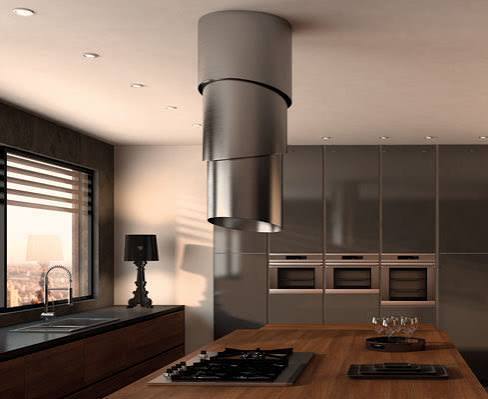 Островные — висят прямо с потолка, идеально, если плита стоит в центре кухни. Смотрится эффектно, но надо продумать, куда деть воздуховод (а он не тонкий).