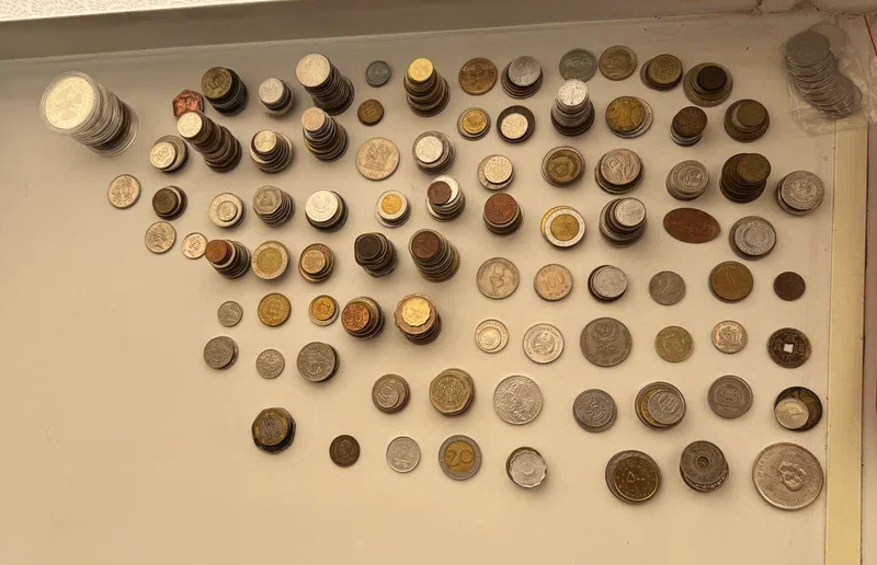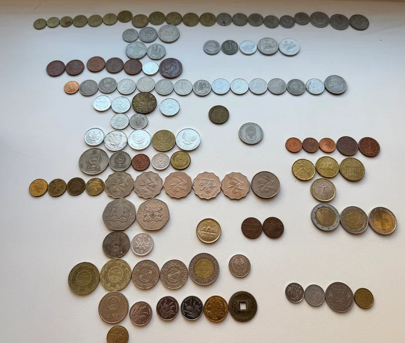 На примере моих изначально оригинальных (повторюсь, под оригинальными я считал неповторяющиеся и более ценные) иностранных монет рассказываю об этапах сортировки. Ниже — часть распределённого из общей коробки. Почему «изначально оригинальных»? Потому что в процессе пересборки иностранных монет они кочевали между коробками, и их повторок примерно половина ушла в оригинал, потому что отличались по номиналу или годам.