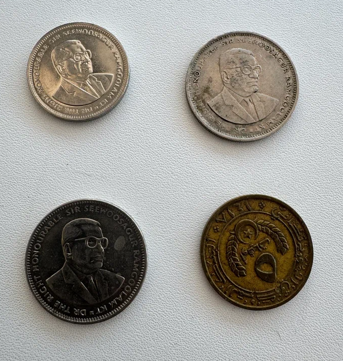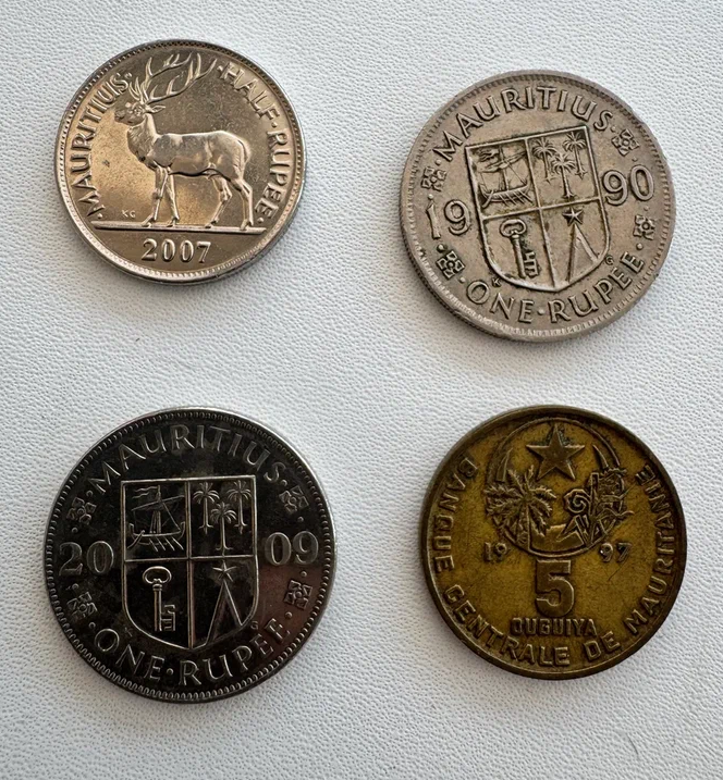 2) Сфотографировать каждую монету спереди и сзади (аверс и реверс). Иногда на одном фото выкладывал монеты либо одного года, либо одного номинала и делал один снимок на условно восемь монет, затем переворачивал и делал ещё один снимок. Либо когда было монет немного (до 10) или когда относились к одному году или в какие-то дни, когда просто уставал и телефон перегревался быстрее обычного. Для примера: на одном фото четыре монеты с Маврикия (как я посчитал изначально), но на самом деле на этом фото была редкая ошибка в сортировке стран. Три монеты — с Маврикия, а правая нижняя — с Мавритании. Эту ошибку обнаружил позднее, но для статьи фото оставил.