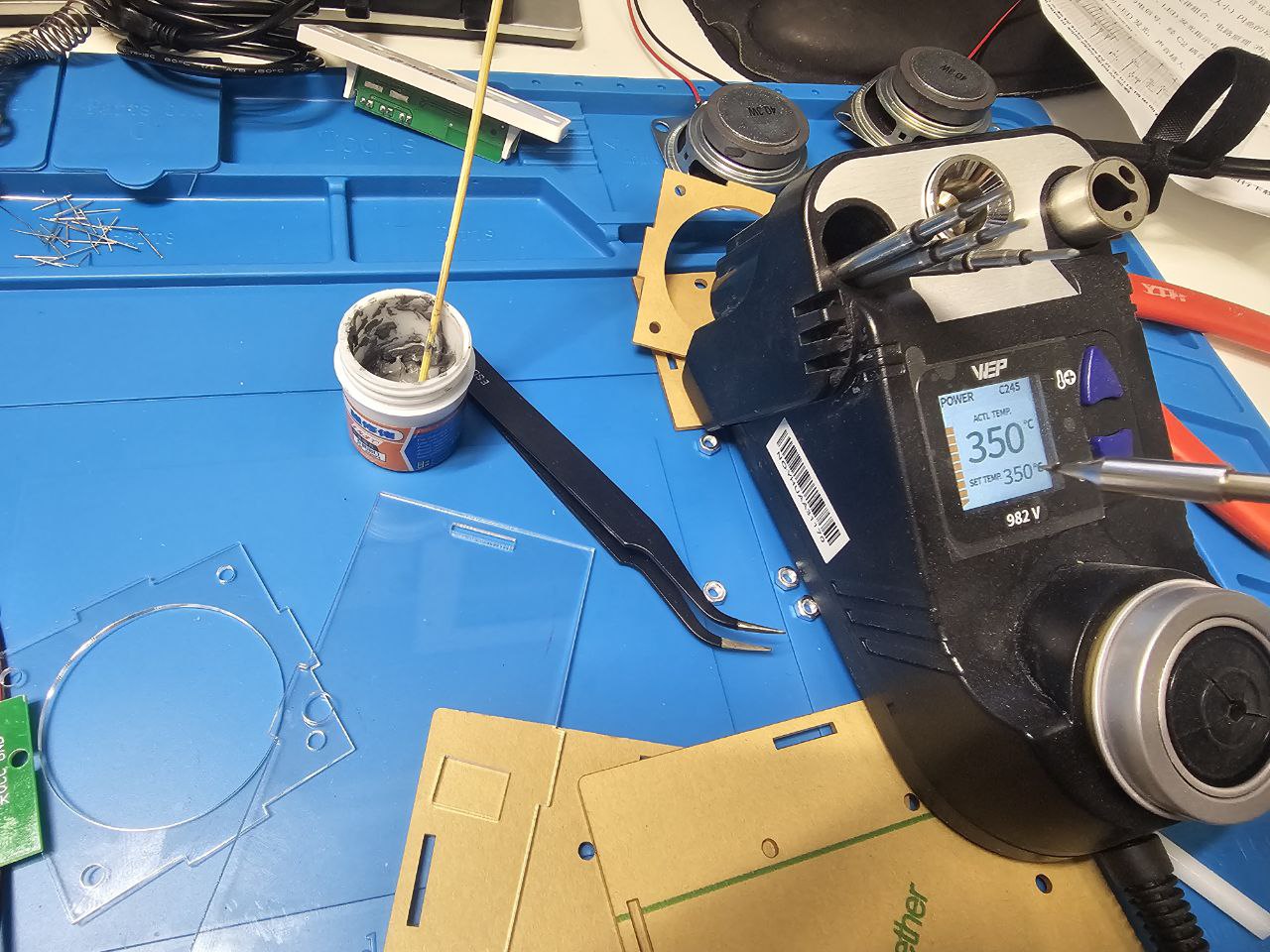 Всегда увлекался пайкой, паял в основном всякие мелочи, отвалившиеся провода, украшения для жены, мелкую электронику. И тут значит дед мороз принес на НГ набор для самостоятельной пайки — bluetooth-колонку. В комплекте были радиодетали, платы, микросхемы, динамики, корпус и все что может пригодиться. Инструкции не было, впрочем она не особо, нужна т.к. на плате нарисовано, куда какую деталь паять. Для пайки я использовал станцию WEP 982V под C245 жала и паяльную пасту Mechanic solder paste. Классические олово и канифоль не использую т.к. при пайке схем в них нет смысла.