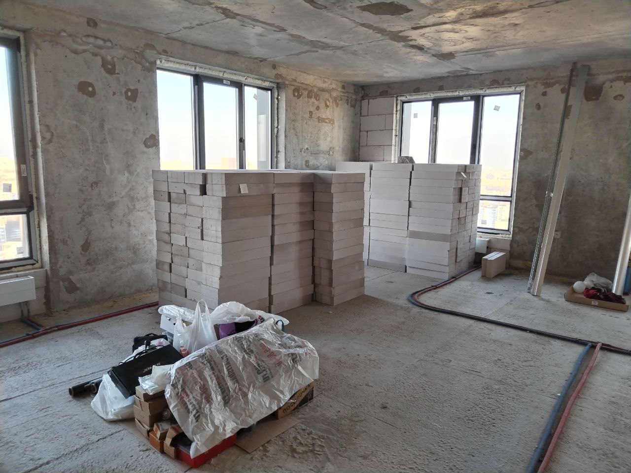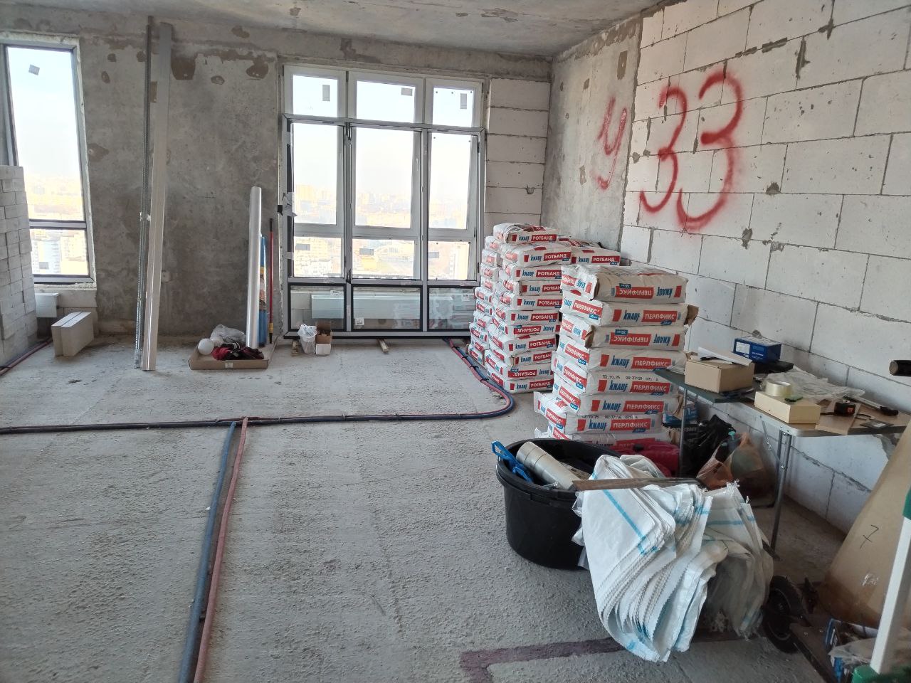 Квартира в новом ЖК в Москве, принята по акту в апреле 2024 года. С тех пор стоит в бетоне. Мы живём в этом же доме, на шесть этажей ниже. Новая квартира — на 33-м, последнем этаже, с пятью окнами и панорамными видами. Планировка от застройщика — евро-трёшка: два санузла, кухня-гостиная и две комнаты.