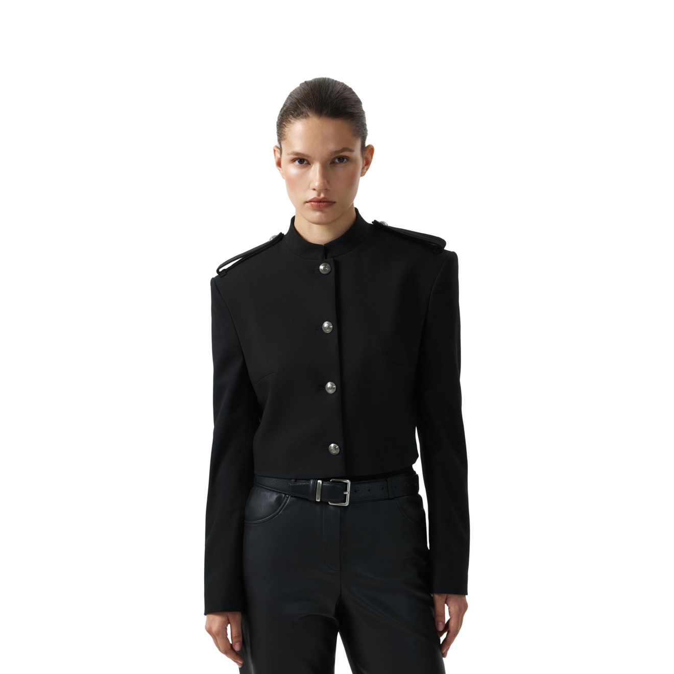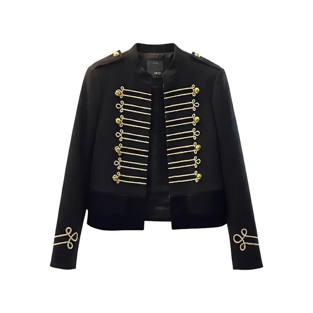 Перед вами — эталонный образец гусарского жакета, сделанный итальянским брендом Pinko. Он укороченной длины, приталенного силуэта и имеет все характерные декоративные элементы: застежки-бранденбургеры, эполеты и вышитые позументы на рукавах
