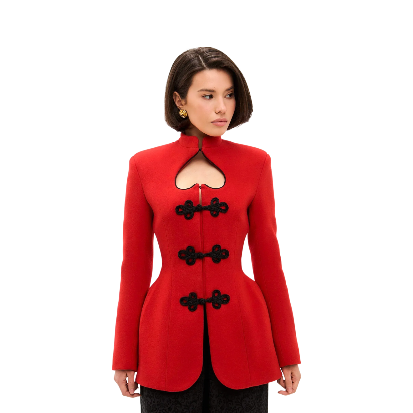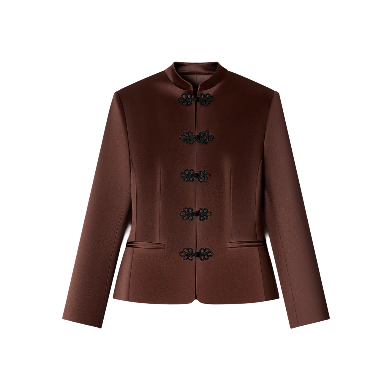 У гусарского жакета есть одежда-побратим: жакет в азиатском стиле — крой и элементы декора этих моделей похожи на первый взгляд. Осенью 2025 года (сайт недоступен из РФ) соцсети взорвали спортивные куртки adidas из лимитированной коллекции бренда, приуроченной к празднованию китайского Нового года, — с теми самыми застежками-лягушками, или панкоу , которые напоминают бранденбургеры. После релиза их моментально раскупили, но тренд на жакет в восточном стиле было уже не остановить — мы даже отметили эту тенденцию в обзоре новогодних коллекций. Ниже — четыре таких жакета в азиатском стиле.