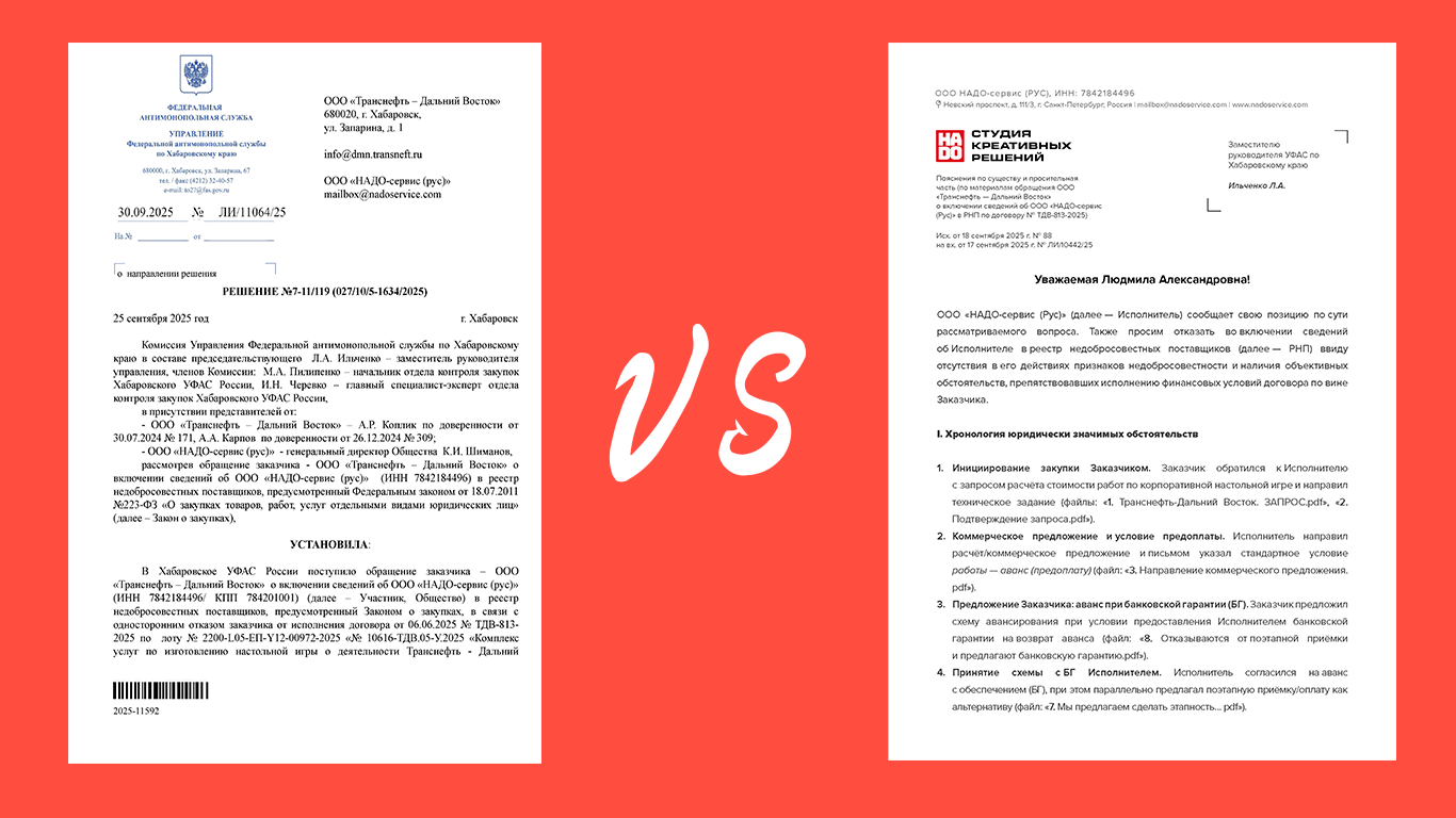 Но здесь история получила продолжение. На почту пришло письмо из УФАС по Хабаровскому краю — нас приглашали на заседание, где рассматривался вопрос о включении компании в РНП. Это стало неожиданностью. Мы не участвовали в закупках по 44-ФЗ или 223-ФЗ, и я не сразу понял, на каком основании может идти речь о РНП.