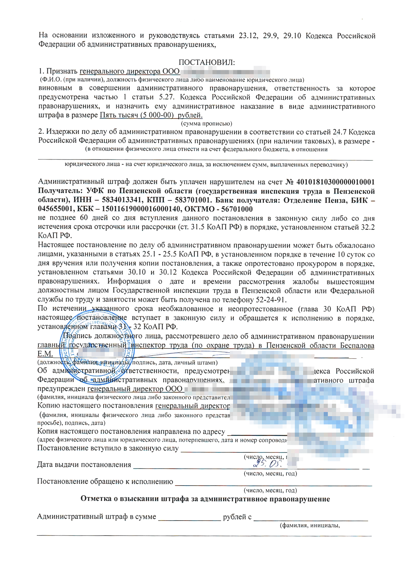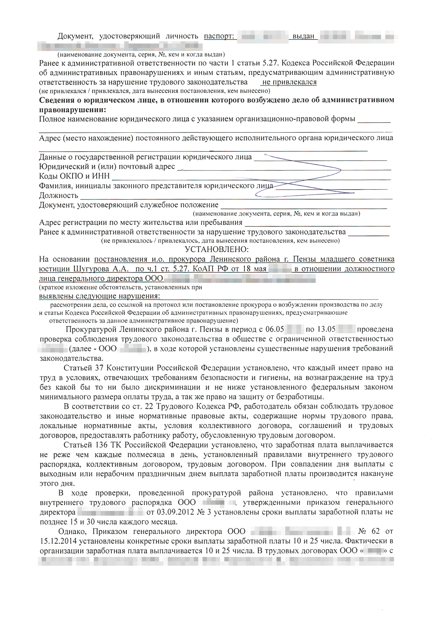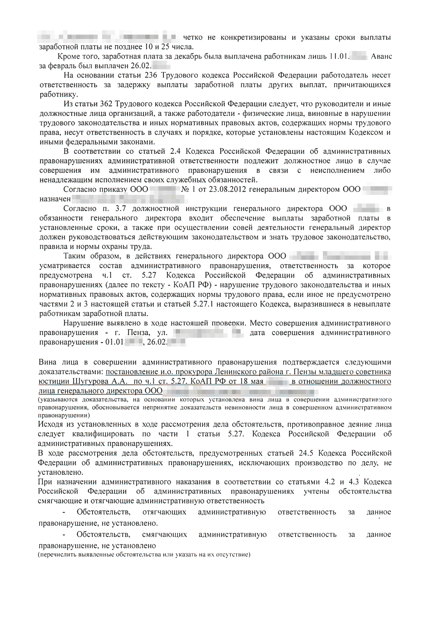 Потом прокуратура привела ГИТ, и вот тут-то — бинго! — они обнаружили небольшие задержки выплаты зарплаты и нарушение в трудовом договоре: дата выплаты зарплаты была указана как интервал. В итоге инспекция назначила мне штраф 5 000 ₽ как должностному лицу, причем не за просрочку выплаты зарплаты, а за неправильно составленный трудовой договор.