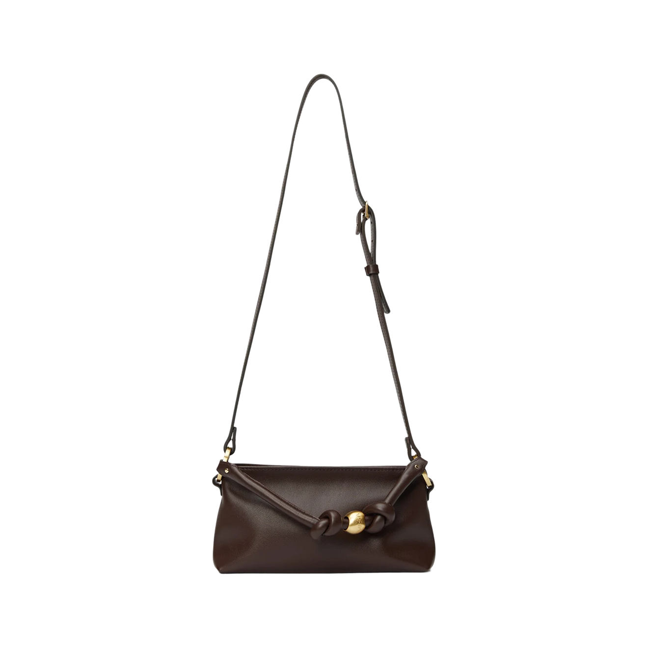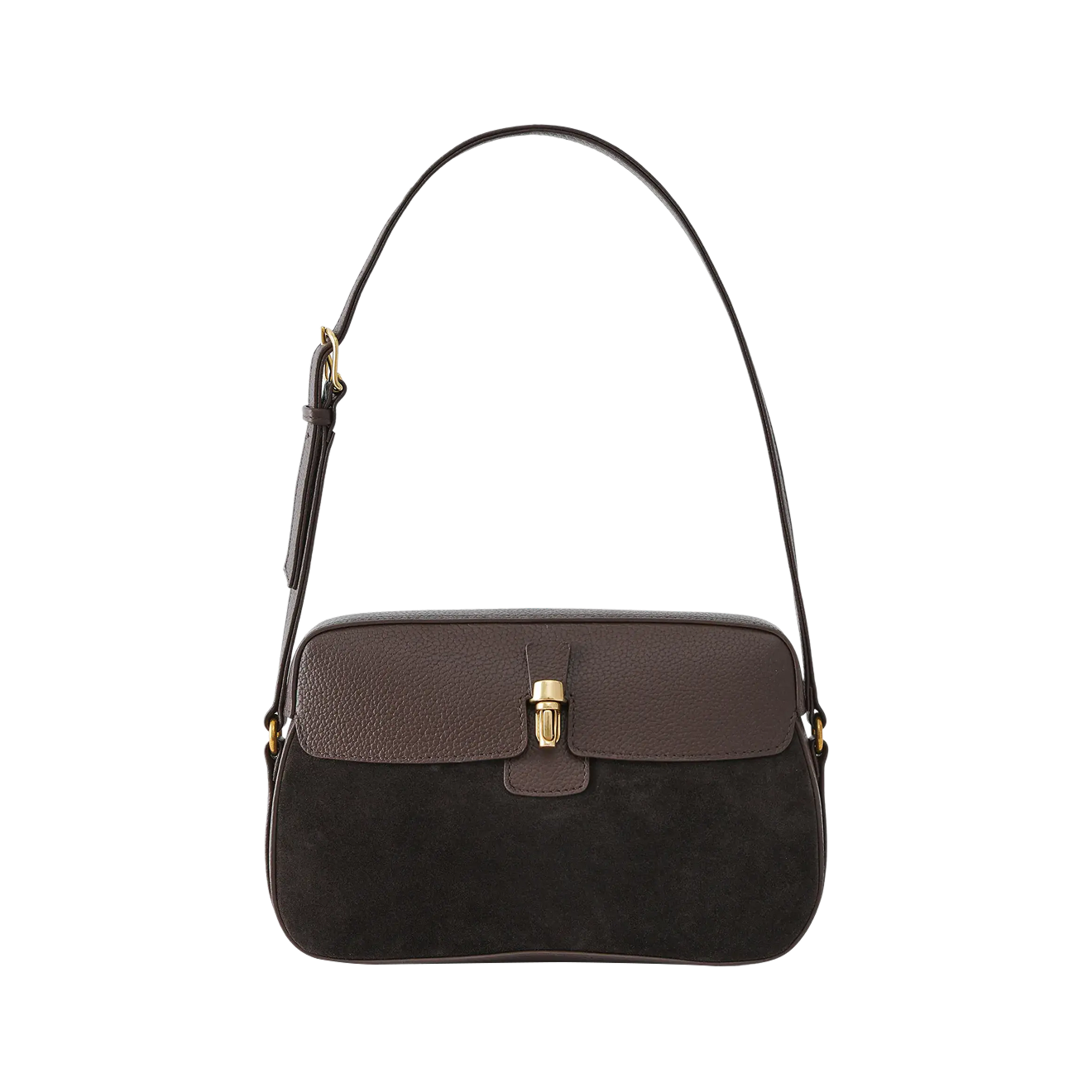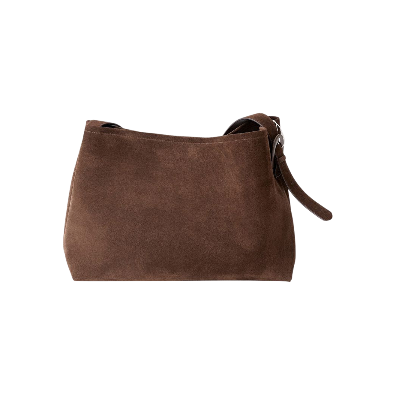 Эта сумка — достойный аналог популярной модели Arket: та же форма, похожий цвет, плечевой ремень и объемная пряжка в тон. По цене вариант Ricoco лишь немного уступает своему прототипу, но главное — купить его прямо сейчас не составит труда, а вот Arket свою сумку в коричневой замше больше не выпускают