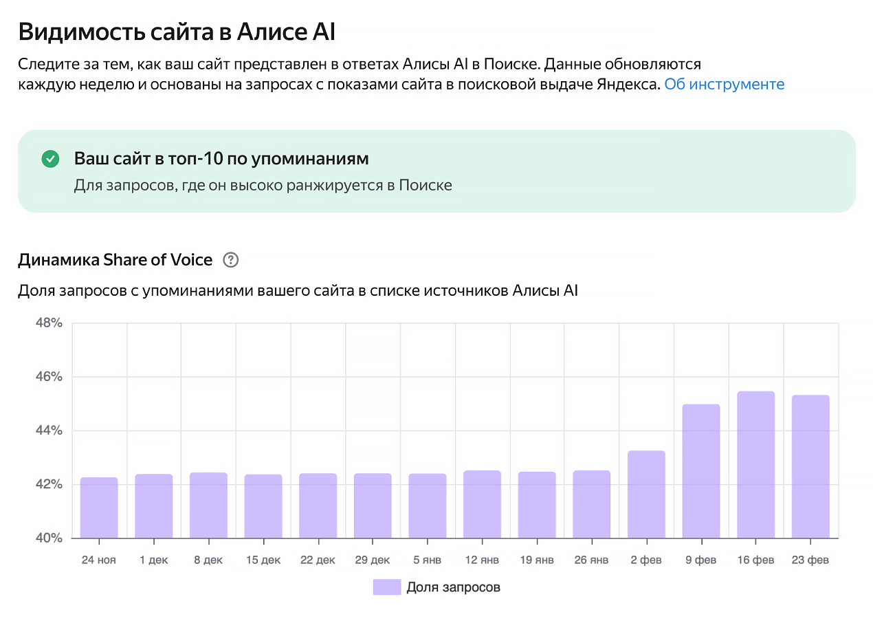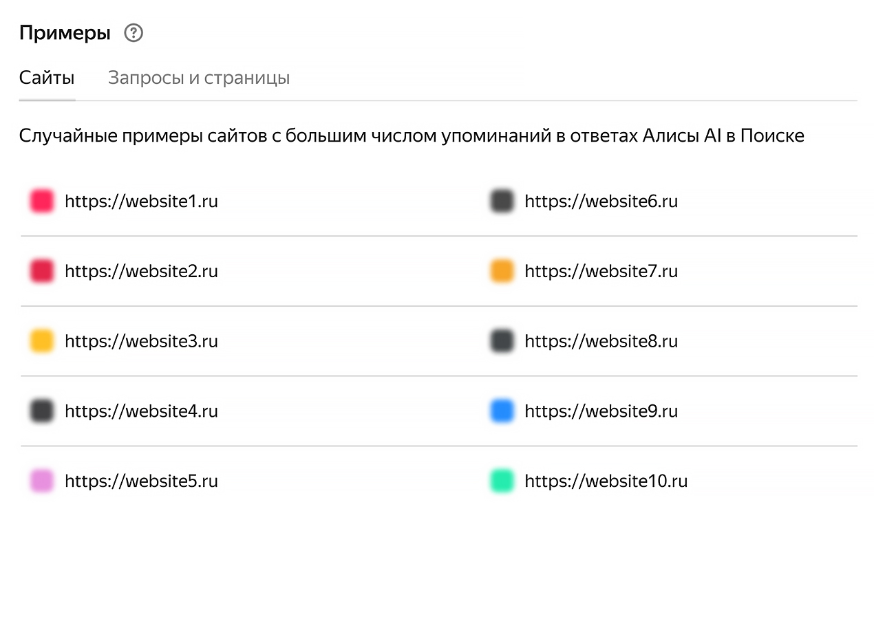 - долю упоминаний сайта среди источников, которые Алиса использует для формирования ответов;